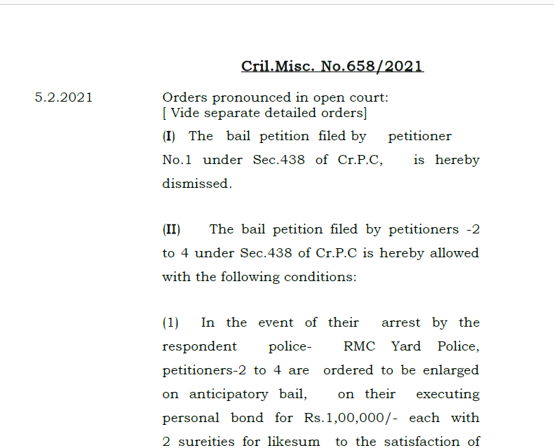 ಈ ಪ್ರಕರಣದ ಇನ್ನುಳಿದ ಮೂವರು ಆರೋಪಿಗಳಾದ ಎಸ್ ಜೆ ಎಂ ವಿದ್ಯಾಪೀಠದ ಕಾರ್ಯದರ್ಶಿ ಎ ಜೆ ಪರಮಶಿವಯ್ಯ, ಮಠದ ಕಾನೂನು ಸಲಹೆಗಾರ ಎನ್.ಗಂಗಾಧರ ಹಾಗೂ ಸ್ಥಳೀಯ ಜಂಗಮ ಸಮಾಜದ ಅಧ್ಯಕ್ಷ ಎಂ.ಟಿ. ಮಲ್ಲಿಕಾರ್ಜುನ ಅವರಿಗೆ ನ್ಯಾಯಾಲಯ ಷರತ್ತುಬದ್ಧ ನಿರೀಕ್ಷಣಾ ಜಾಮೀನು ಮಂಜೂರು ಮಾಡಿದೆ.