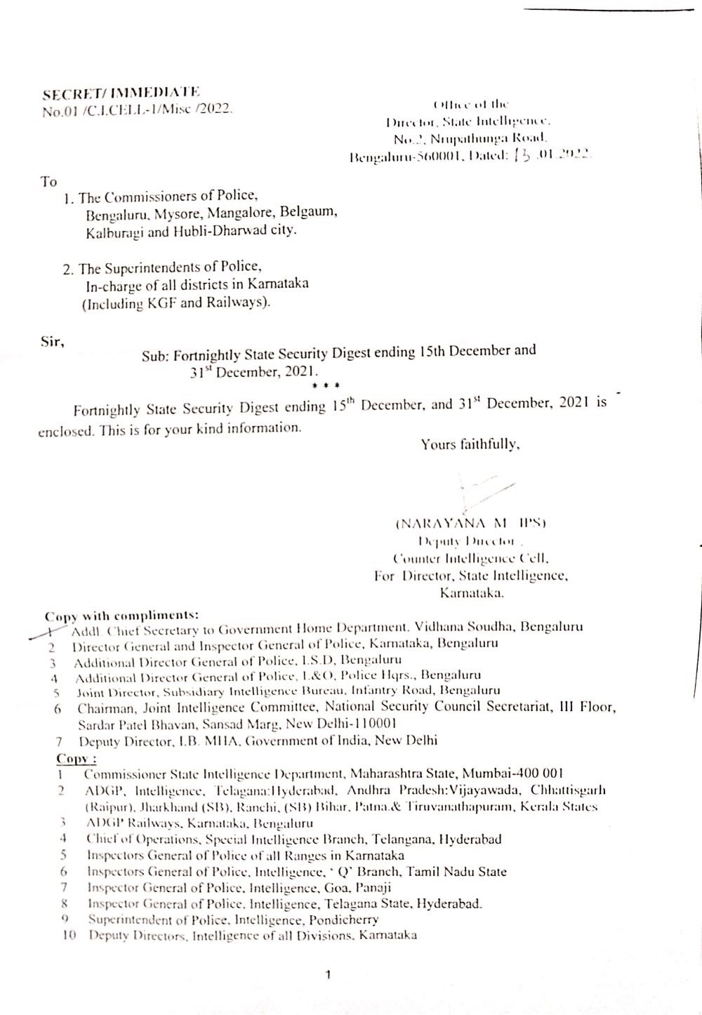 ಬೆಂಗಳೂರು, ಮೈಸೂರು, ಮಂಗಳೂರು, ಬೆಳಗಾವಿ, ಕಲ್ಬುರ್ಗಿ ಮತ್ತು ಹುಬ್ಬಳ್ಳಿ ಧಾರವಾಡ ಪೊಲೀಸ್ ಕಮಿಷನರ್‌ಗಳಿಗೆ ಮತ್ತು ರಾಜ್ಯದ ಎಲ್ಲಾ ಜಿಲ್ಲೆಗಳ ಪೊಲೀಸ್‌ ವರಿಷ್ಠಾಧಿಕಾರಿಗಳಿಗೆ ಈ ರಹಸ್ಯ ಪತ್ರವನ್ನು (NO 01/C.I.CELL-1/MISC/2022) 2022ರ ಜನವರಿ 13ರಂದು ಸಿ. ಐ. ಸೆಲ್‌ನ ಉಪ ನಿರ್ದೇಶಕ ಎಂ ನಾರಾಯಣ ಅವರು ಬರೆದಿದ್ದಾರೆ. ಈ ಪತ್ರದ ಪ್ರತಿ ‘ದಿ ಫೈಲ್‌’ಗೆ ಲಭ್ಯವಾಗಿದೆ.