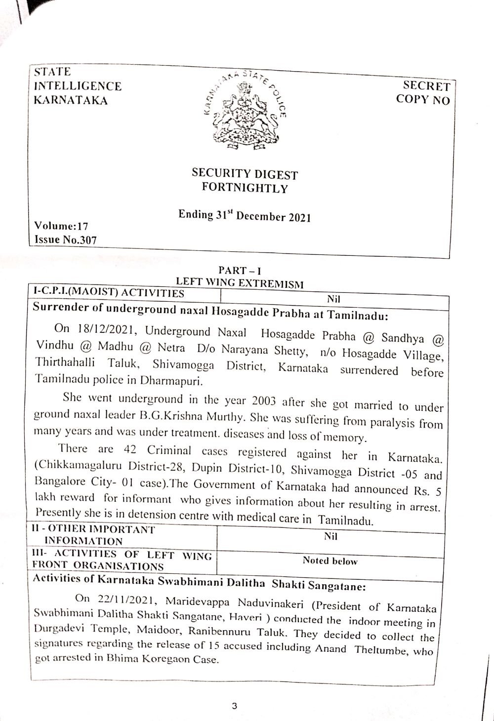 ಇದೇ ಪತ್ರದಲ್ಲಿ ನಕ್ಸಲ್‌ ಹೊಸಗದ್ದೆ ಪ್ರಭಾ ಎಂಬುವರು 2021ರ ಡಿಸೆಂಬರ್‌ 18ರಂದು ತಮಿಳುನಾಡಿನ ಧರ್ಮಪುರಿಯಲ್ಲಿ ಶರಣಾಗಿರುವ ಕುರಿತು ಮಾಹಿತಿಯೂ ಇದೆ. 2003ರಿಂದ ಹೊಸಗದ್ದೆ ಪ್ರಭಾ ಭೂಗತರಾಗಿದ್ದರು. ಆ ನಂತರ ನಕ್ಸಲ್‌ ಮುಖಂಡ ಬಿ ಜಿ ಕೃಷ್ಣಮೂರ್ತಿ ಅವರನ್ನು ವಿವಾಹವಾದರು. ಕಳೆದ ಹಲವು ವರ್ಷಗಳಿಂದ ಪ್ಯಾರಲಿಸಿಸ್‌ನಿಂದ ಬಳಲುತ್ತಿದ್ದು ಸದ್ಯ ಚಿಕಿತ್ಸೆ ಪಡೆಯುತ್ತಿದ್ದಾರೆ ಎಂಬ ವಿವರಣೆಯು ಪತ್ರದಲ್ಲಿರುವುದು ಗೊತ್ತಾಗಿದೆ.