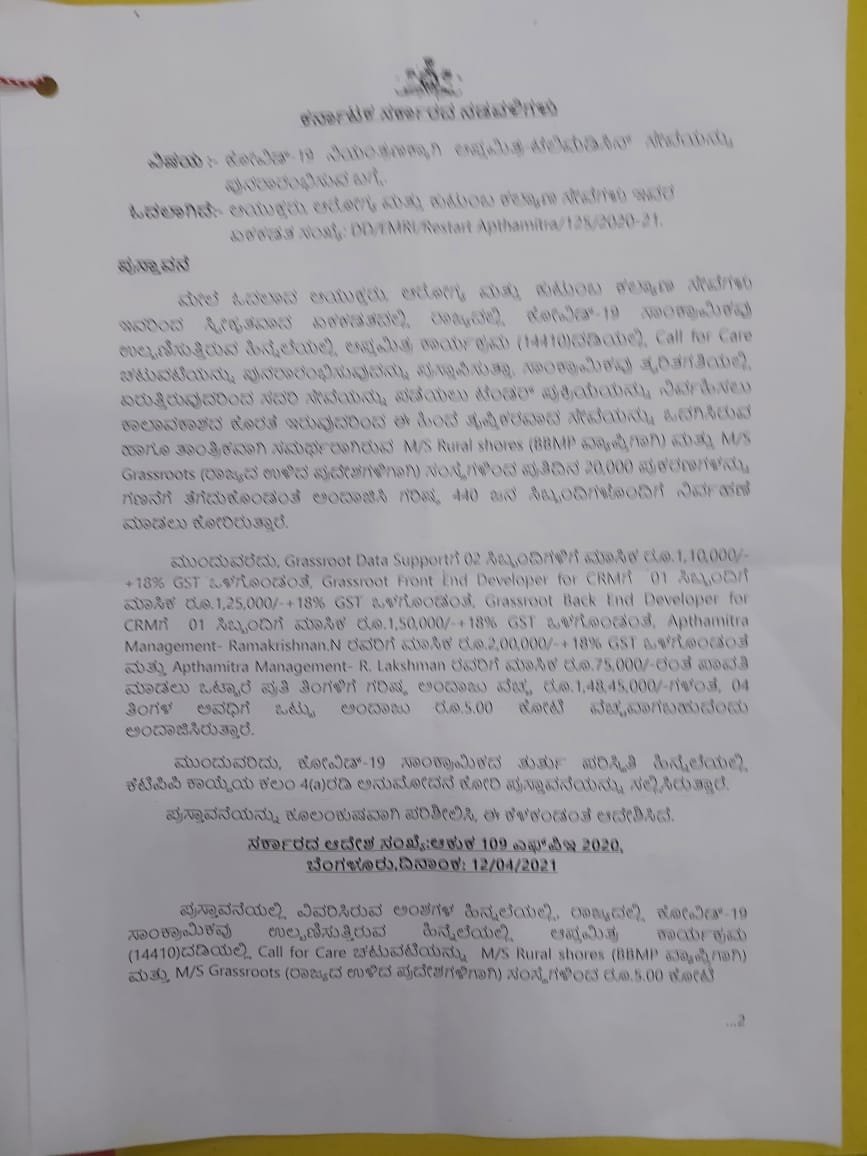 ಅದೇ ರೀತಿ ಗ್ರಾಸ್ ರೂಟ್ಸ್ ಸಂಸ್ಥೆಯ ಸಿಬ್ಬಂದಿಗಳಿಗೆ ಮಾಸಿಕ 1,10,000 ರು., (ಜಿಎಸ್ಟಿ ಶೇ.18 ಒಳಗೊಂಡಂತೆ) ಇದೇ ಸಂಸ್ಥೆಯ ಫ್ರಂಟ್ ಎಂಡ್ ಡೆವಲಪರ್ಗೆ ಮಾಸಿಕ 1,25,000 ರು., (ಜಿಎಸ್ಟಿ ಶೇ.18 ಒಳಗೊಂಡಂತೆ) ಬ್ಯಾಕ್ ಎಂಡ್ ಡೆವಲಪರ್ಗೆ 1,50,000 ರು., ರಾಮಕೃಷ್ಣನ್ ಎನ್ ಎಂಬುವರಿಗೆ ಮಾಸಿಕ 2,00,000 ರು. , ಲಕ್ಷ್ಮಣ್ ಎಂಬುವರಿಗೆ ಮಾಸಿಕ 75,000 ರು. ಪಾವತಿ ಮಾಡಲು ಒಟ್ಟಾರೆ ಪ್ರತಿ ತಿಂಗಳು ಗರಿಷ್ಠ ಅಂದಾಜು ವೆಚ್ಚ 1,48,45,000 ರು ನಂತೆ 4 ತಿಂಗಳ ಅವಧಿಗೆ 5.00 ಕೋಟಿ ವೆಚ್ಚಕ್ಕೆ ಕೆಟಿಪಿಪಿ ಕಾಯ್ದೆಯ 4 (ಎ) ಇಲಾಖೆ ಹಂತದಲ್ಲೇ ಅನುಮೋದಿಸಿರುವುದು 2021ರ ಏಪ್ರಿಲ್ 12ರಂದು ಹೊರಡಿಸಿರುವ ಆದೇಶದಿಂದ ಗೊತ್ತಾಗಿದೆ.