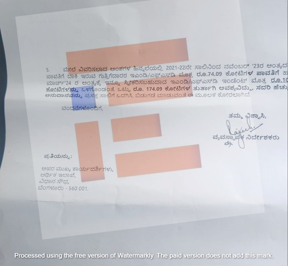 ‘ಈ ಎಲ್ಲಾ ಅಂಶಗಳ ಹಿನ್ನೆಲೆಯಲ್ಲಿ 2021-22ನೇ ಸಾಲಿನಿಂದ ನವೆಂಬರ್ 23ರ ಅಂತ್ಯದವರೆಗೂ ಪಾವತಿಗೆ ಬಾಕಿ ಇರುವ ಗುತ್ತಿಗೆದಾರರ ಇಎಂಡಿ ಮತ್ತು ಎಫ್ಎಸ್ಡಿ ಮೊತ್ತ 74.09 ಕೋಟಿ ರು.ಗಳ ಪಾವತಿಗೆ ಹಾಗೂ ಮಾರ್ಚ್ 2024ರ ಅಂತ್ಯಕ್ಕೆ ಇನ್ನು ಸ್ವೀಕರಿಸಬಹುದಾದ ಇಎಂಡಿ ಮತ್ತು ಎಫ್ಎಸ್ಡಿ ಇಂಡೆಂಟ್ ಮೊತ್ತ 100 ಕೋಟಿ ರು ಸೇರಿ ಒಟ್ಟಾರೆ 174.09 ಕೋಟಿ ರು ತುರ್ತಾಗಿ ಅವಶ್ಯವಿದೆ. ಹೆಚ್ಚುವರಿ ಅನುದಾನವನ್ನು ಒದಗಿಸಬೇಕು,’ ಎಂದು ನಿಗಮದ ಹಾಲಿ ವ್ಯವಸ್ಥಾಪಕ ನಿರ್ದೇಶಕರು ಸರ್ಕಾರವನ್ನು ಕೋರಿದ್ದರು.