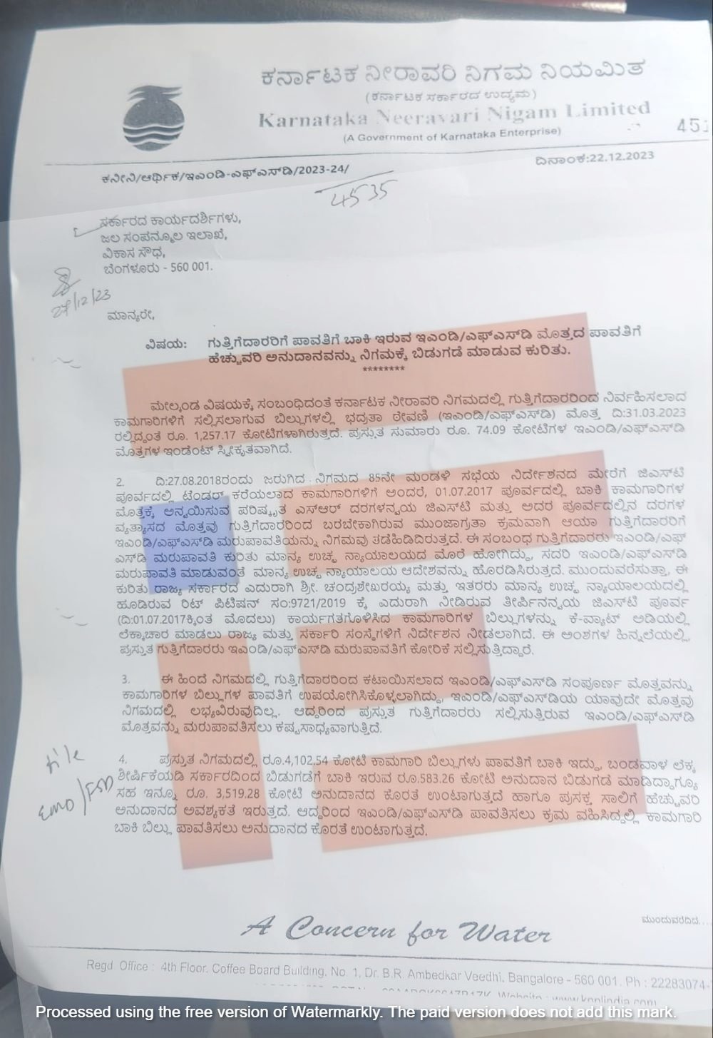 2023ರ ಡಿಸೆಂಬರ್ 22ರ ಅಂತ್ಯಕ್ಕೆ ನಿಗಮದಲ್ಲಿ 4,102.54 ಕೋಟಿ ರು ಕಾಮಗಾರಿಗಳ ಬಿಲ್ಗಳು ಪಾವತಿಗೆ ಬಾಕಿ ಇತ್ತು. ಬಂಡವಾಳ ಲೆಕ್ಕ ಶೀರ್ಷಿಕೆಯಡಿ ಸರ್ಕಾರದಿಂದ 583.26 ಕೋಟಿ ರು. ಕೂಡ ಬಿಡುಗಡೆಗೆ ಬಾಕಿ ಇತ್ತು. ಈ ಹಣವನ್ನು ಬಿಡುಗಡೆ ಮಾಡಿದರೂ ಸಹ ಇನ್ನೂ 3,519.28 ಕೋಟಿ ರು. ಅನುದಾನ ಕೊರತೆ ಉಂಟಾಗಿತ್ತು. ಅಲ್ಲದೇ 2023-24ನೇ ಸಾಲಿನಲ್ಲಿಯೇ ಹೆಚ್ಚುವರಿ ಅನುದಾನದ ಅವಶ್ಯಕತೆಯೂ ಇತ್ತು. ಆದ್ದರಿಂದ ಇಎಂಡಿ ಮತ್ತು ಎಫ್ಎಸ್ಡಿ ಪಾವತಿಸಲು ಕ್ರಮ ವಹಿಸಿದ್ದಲ್ಲಿ ಕಾಮಗಾರಿ ಬಾಕಿ ಬಿಲ್ ಪಾವತಿಸಲು ಅನುದಾನ ಕೊರತೆ ಉಂಟಾಗುತ್ತದೆ ಎಂದೂ ಪತ್ರದಲ್ಲಿ ವಿವರಿಸಿದ್ದರು.