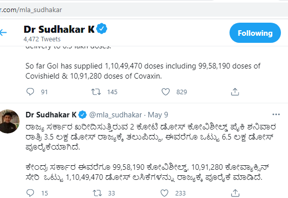 ರಾಜ್ಯ ಸರ್ಕಾರ ಖರೀದಿಸುತ್ತಿರುವ 2 ಕೋಟಿ ಡೋಸ್ ಕೋವಿಶೀಲ್ಡ್ ಪೈಕಿ ಶನಿವಾರ ರಾತ್ರಿ 3.5 ಲಕ್ಷ ಡೋಸ್ ರಾಜ್ಯಕ್ಕೆ ತಲುಪಿದೆ. ಈವರೆಗೂ ಒಟ್ಟು 6.5 ಲಕ್ಷ ಡೋಸ್ ಪೂರೈಕೆಯಾಗಿದೆ. ಕೇಂದ್ರ ಸರ್ಕಾರ ಈವರೆಗೂ 99,58,190 ಕೋವಿಶೀಲ್ಡ್, 10,91,280 ಕೋವ್ಯಾಕ್ಸಿನ್ ಸೇರಿ ಒಟ್ಟು 1,10,49,470 ಡೋಸ್ ಲಸಿಕೆಗಳನ್ನು ರಾಜ್ಯಕ್ಕೆ ಪೂರೈಕೆ ಮಾಡಿದೆ ಎಂದು ಆರೋಗ್ಯ ಮತ್ತು ಕುಟುಂಬ ಕಲ್ಯಾಣ ಸಚಿವ ಡಾ ಕೆ ಸುಧಾಕರ್ ಅವರು ಇತ್ತೀಚೆಗಷ್ಟೇ ಟ್ವೀಟ್ ಮಾಡಿದ್ದರು.