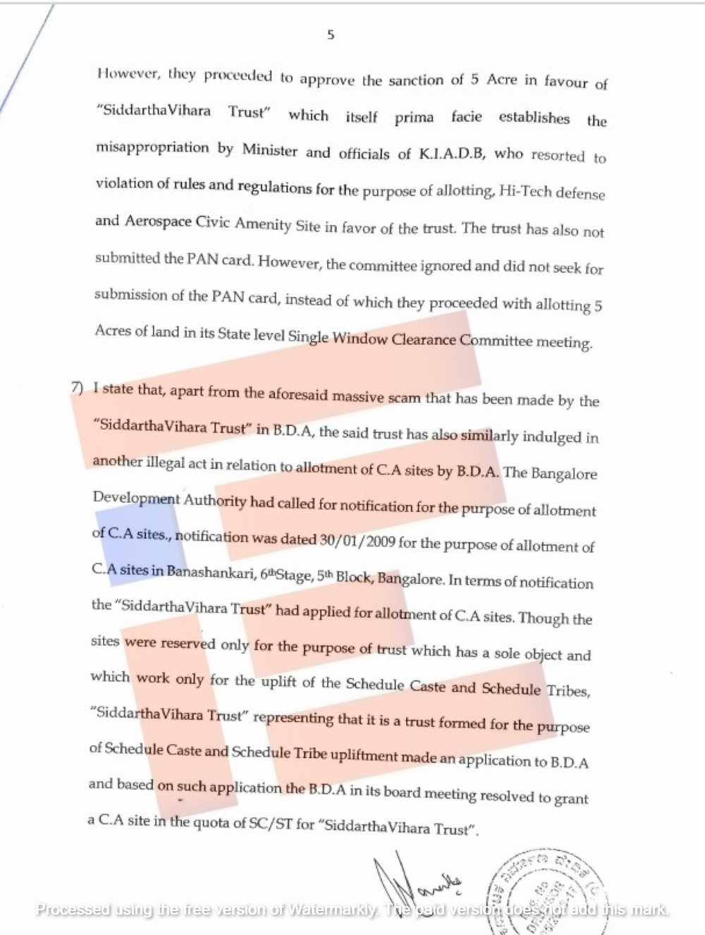 ಸಿದ್ದಾರ್ಥ ವಿಹಾರ ಟ್ರಸ್ಟ್ಗೆ ಕೆಐಎಡಿಬಿ, ಬಿಡಿಎಯು ನಿಯಮಗಳನ್ನು ಉಲ್ಲಂಘಿಸಿ ಪರಿಶಿಷ್ಟ ಜಾತಿ ಕೋಟಾದಡಿಯಲ್ಲಿ ಸಿ ಎ ನಿವೇಶನಗಳನ್ನು ಮಂಜೂರು ಮಾಡಿದೆ. ಸಿದ್ದಾರ್ಥ ವಿಹಾರ ಟ್ರಸ್ಟ್, ಪರಿಶಿಷ್ಟ ಜಾತಿ ಪ್ರಾತಿನಿಧ್ಯದಡಿಯಲ್ಲಿ ಮೀಸಲಾತಿಗೆ ಅನರ್ಹವಾಗಿದ್ದರೂ ಸಹ ಸಿ ಎ ನಿವೇಶನಗಳನ್ನು ಮಂಜೂರು ಮಾಡಿಸಿಕೊಂಡಿದೆ ಎಂದು ಲಂಚಮುಕ್ತ ಕರ್ನಾಟಕ ನಿರ್ಮಾಣ ವೇದಿಕೆಯು ದೂರಿನಲ್ಲಿ ವಿವರಿಸಿರುವುದು ಗೊತ್ತಾಗಿದೆ.