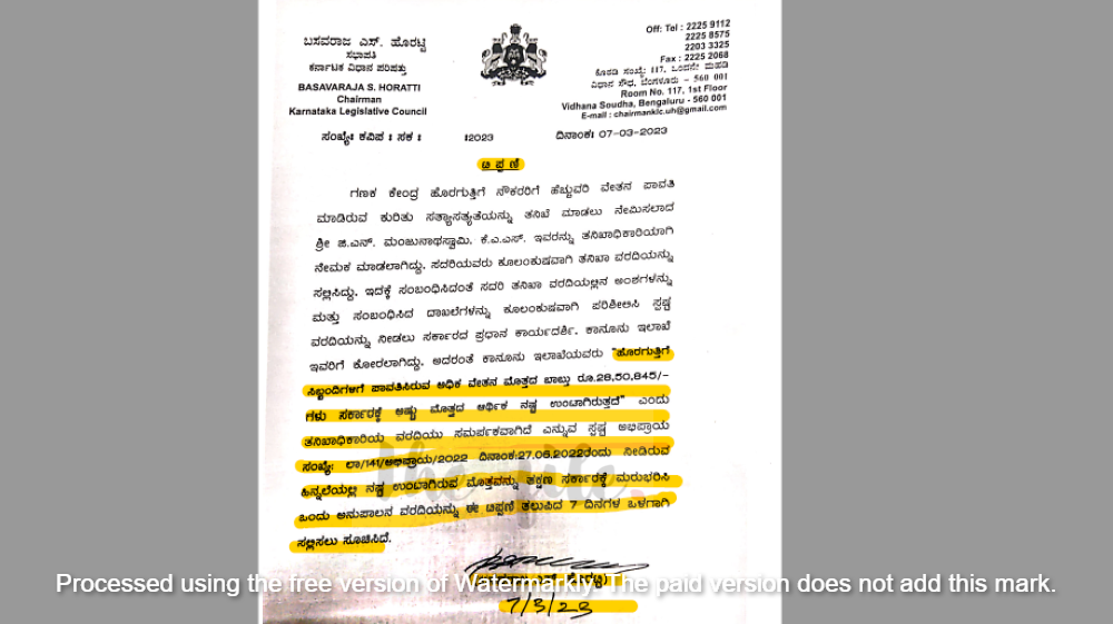 ಹೊರಗುತ್ತಿಗೆ ನೌಕರರಿಗೆ ಪಾವತಿಸಿದ್ದ 48.42 ಲಕ್ಷ ರು ಪೈಕಿ ಒಟ್ಟು 28.50 ಲಕ್ಷ ರು. ಹೆಚ್ಚುವರಿಯಾಗಿ ಪಾವತಿಯಾಗಿತ್ತು. ಈ ಹಣವನ್ನು ವಾರದೊಳಗೆ ವಸೂಲು ಮಾಡಬೇಕು ಎಂದು ಸಭಾಪತಿ ಬಸವರಾಜ ಹೊರಟ್ಟಿ ಅವರು 2023ರ ಮಾರ್ಚ್‌ 7ರಂದು ಟಿಪ್ಪಣಿ ಹೊರಡಿಸಿದ್ದರು. ಕಾನೂನು ಇಲಾಖೆಯು ನೀಡಿರುವ ಅಭಿಪ್ರಾಯದಂತೆ ಸಭಾಪತಿ ಬಸವರಾಜ ಹೊರಟ್ಟಿ ಅವರು ಹಣ ವಸೂಲು ಮಾಡಬೇಕು ಎಂದು ಕಾರ್ಯದರ್ಶಿ ಕೆ ಆರ್‌ ಮಹಾಲಕ್ಷ್ಮಿ ಅವರಿಗೆ ಸೂಚಿಸಿದ್ದರು. ಆದರೆ ಇದುವರೆಗೂ ಬಿಡಿಗಾಸನ್ನೂ ವಸೂಲು ಮಾಡದೆಯೇ ಸಭಾಪತಿಗಳ ಟಿಪ್ಪಣಿಯನ್ನೂ ಕಸದ ಬುಟ್ಟಿಗೆ ಎಸೆದಿರುವುದು ಮೇಲ್ನೋಟಕ್ಕೆ ಕಂಡು ಬಂದಿದೆ.