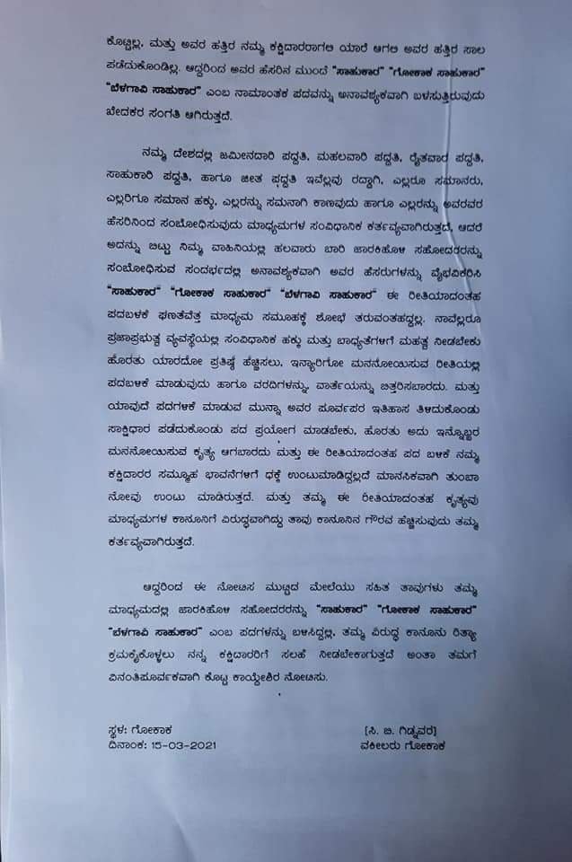 ನೋಟೀಸ್ ತಲುಪಿದ ಕೂಡಲೇ ತಮ್ಮ ಮಾಧ್ಯಮದಲ್ಲಿ ಜಾರಕಿಹೊಳಿ ಸೋದರರನ್ನು ಸಾಹುಕಾರ, ಗೋಕಾಕ ಸಾಹುಕಾರ, ಬೆಳಗಾವಿ ಸಾಹುಕಾರ ಎಂಬ ಪದಗಳನ್ನು ಬಳಸಿದ್ದಲ್ಲಿ ತಮ್ಮ ವಿರುದ್ಧ ಕಾನೂನು ರೀತಿ ಕ್ರಮ ಕೈಗೊಳ್ಳಲು ನನ್ನ ಕಕ್ಷಿದಾರರಿಗೆ ಸಲಹೆ ನೀಡಬೇಕಾಗುತ್ತದೆ ಎಂದು ವಕೀಲ ಸಿ ಬಿ ಗಿಡ್ಡವರ ಅವರು ಮಾಧ್ಯಮಗಳ ಮುಖ್ಯಸ್ಥರಿಗೆ ನೋಟೀಸ್ನಲ್ಲಿ ತಿಳಿಸಿದ್ದಾರೆ.