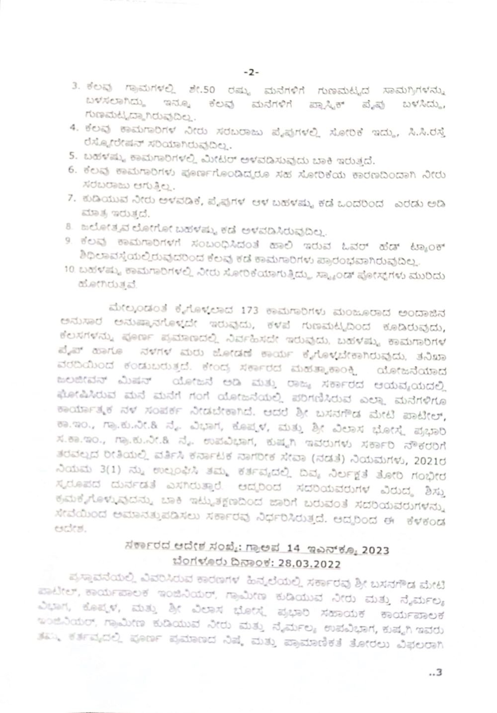 ಕೊಪ್ಪಳ ಜಿಲ್ಲೆಯ ಕುಷ್ಟಗಿ ತಾಲೂಕಿನಲ್ಲಿ 2020-21ನೇ ಸಾಲಿನಲ್ಲಿ ಜೆಜೆಎಂ ಅಡಿಯಲ್ಲಿ ಮಂಜೂರಾಗಿದ್ದ 173 ಕಾಮಗಾರಿಗಳನ್ನು ನಿಗದಿತ ಕಾಲಮಿತಿಯೊಳಗೆ ಮುಕ್ತಾಯಗೊಳಿಸಬೇಕು ಎಂದು ಸೂಚಿಸಲಾಗಿತ್ತು. ಆದರೂ ಸಹ ಕಾಮಗಾರಿಗಳನ್ನು ಉತ್ತಮ ಗುಣಮಟ್ಟದಲ್ಲಿ ಅನುಷ್ಟಾನದಲ್ಲಿ ಇಂಜಿನಿಯರ್ಗಳು ವಿಫಲರಾಗಿದ್ದರು. ಈ ಸಂಬಂಧ ಬಸನಗೌಡ ಮೇಟಿ ಪಾಟೀಲ್, ವಿಲಾಸ್ ಭೋಸ್ಲೆ ಎಂಬ ಇಂಜಿನಿಯರ್ಗಳನ್ನು ಅಮಾನತುಗೊಳಿಸಿರುವುದು ಆದೇಶದಿಂದ ತಿಳಿದು ಬಂದಿದೆ.
