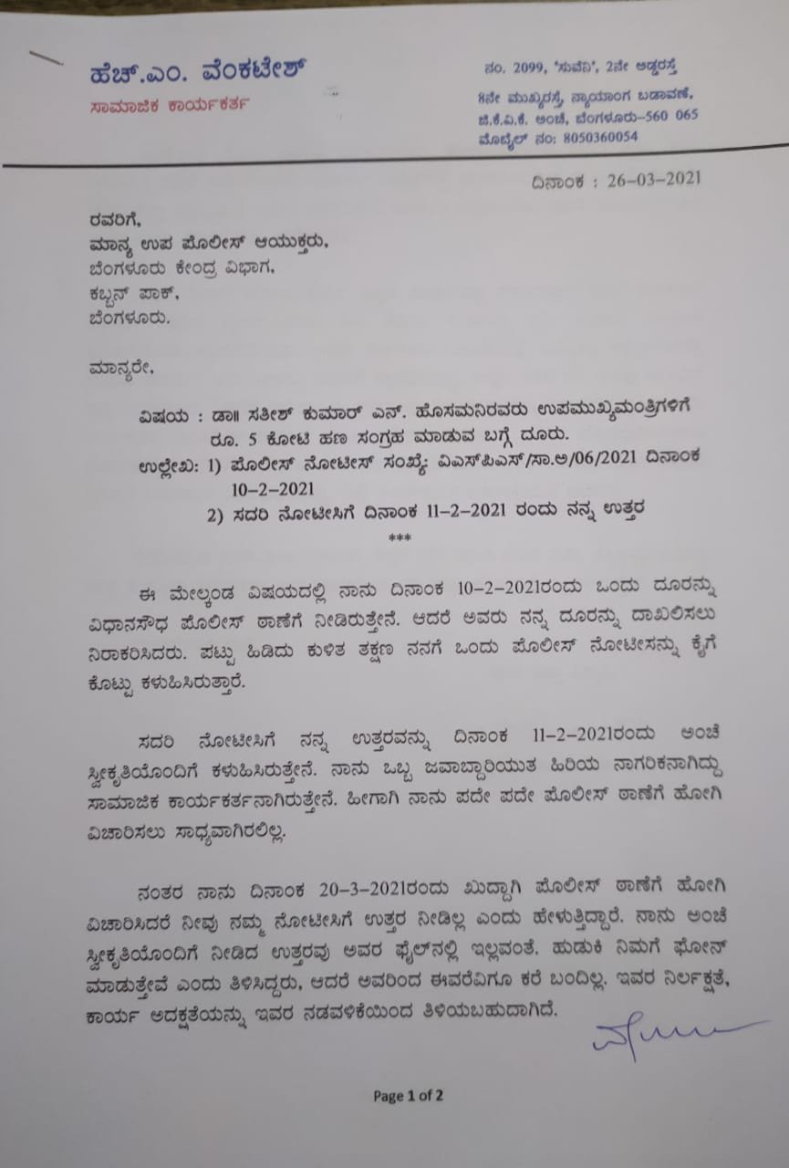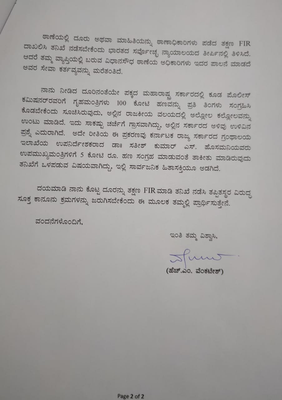 ಹಾಗೆಯೇ ‘ನಾನು ನೀಡಿದ್ದ ದೂರಿನಂತೆಯೇ ಮಹಾರಾಷ್ಟ್ರ ಸರ್ಕಾರದಲ್ಲಿ ಕೂಡ ಪೊಲೀಸ್ ಕಮಿಷನರ್ಗೆ ಗೃಹ ಮಂತ್ರಿಗಳು 100 ಕೋಟಿ ಹಣವನ್ನು ಪ್ರತಿ ತಿಂಗಳು ಸಂಗ್ರಹಿಸಿ ಕೊಡಬೇಕೆಂದು ಸೂಚಿಸಿರುವುದು ಅಲ್ಲಿನ ರಾಜಕೀಯ ವಲಯದಲ್ಲಿ ಅಲ್ಲೋಲ ಕಲ್ಲೋಲಗಳನ್ನು ಉಂಟು ಮಾಡಿದೆ. ಅಲ್ಲಿನ ಸರ್ಕಾರದ ಅಳಿವು ಉಳಿವು ಪ್ರಶ್ನೆಯೂ ಎದುರಾಗಿದೆ. ಅದೇ ರೀತಿಯಲ್ಲಿ ಈ ಪ್ರಕರಣವು ಕರ್ನಾಟಕ ಸರ್ಕಾರದ ಗ್ರಂಥಾಲಯ ಇಲಾಖೆಯ ನಿರ್ದೇಶಕ ಡಾ ಸತೀಶ್ಕುಮಾರ್ ಹೊಸಮನಿ ಅವರು ಉಪ ಮುಖ್ಯಮಂತ್ರಿಗಳಿಗೆ 5 ಕೋಟಿ ಹಣ ಸಂಗ್ರಹ ಮಾಡುವಂತೆ ತಾಕೀತು ಮಾಡಿರುವುದು ತನಿಖೆಗೆ ಒಳಪಡುವ ವಿಷಯವಾಗಿದೆ. ಇದರಲ್ಲಿ ಸಾರ್ವಜನಿಕ ಹಿತಾಸಕ್ತಿಯೂ ಅಡಗಿದೆ. ಹೀಗಾಗಿ ದೂರನ್ನಾಧರಿಸಿ ತಕ್ಷಣವೇ ಎಫ್ಐಆರ್ ಮಾಡಿ ತಪ್ಪಿತಸ್ಥರ ವಿರುದ್ಧ ಸೂಕ್ತ ಕಾನೂನು ಕ್ರಮ ಜರುಗಿಸಬೇಕು,’ ಎಂದೂ ಉಪ ಆಯುಕ್ತರಿಗೆ ಮನವಿ ಮಾಡಿರುವುದು ಪತ್ರದಿಂದ ತಿಳಿದು ಬಂದಿದೆ.