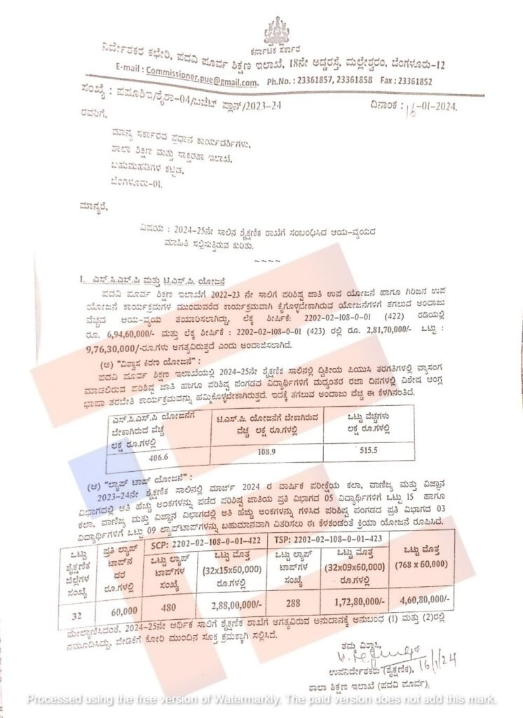 ವಿಶ್ವಾಸ ಕಿರಣ ಹೆಸರಿನಲ್ಲಿ ಪರಿಶಿಷ್ಟ ಜಾತಿ ಮತ್ತು ಪರಿಶಿಷ್ಟ ಪಂಗಡದ ವಿದ್ಯಾರ್ಥಿಗಳಿಗೆ ಉಚಿತವಾಗಿ ಲ್ಯಾಪ್ಟಾಪ್ ವಿತರಿಸುವ ಸಂಬಂಧ 9 ಕೋಟಿ ರು. ಅಂದಾಜು ವೆಚ್ಚದ ಪ್ರಸ್ತಾವನೆಯನ್ನು ಪದವಿಪೂರ್ವ ಶಿಕ್ಷಣ ಮಂಡಳಿಯ ಉಪನಿರ್ದೇಶಕರು (ಶೈಕ್ಷಣಿಕ) ಸರ್ಕಾರದ ಪ್ರಧಾನ ಕಾರ್ಯದರ್ಶಿಗೆ 2024ರ ಜನವರಿ 16ರಂದೇ ಪ್ರಸ್ತಾವನೆ ಸಲ್ಲಿಸಿದ್ದರು.