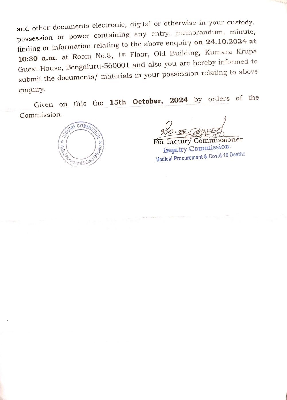 ಈ ವರದಿಗಳಿಗೆ ಸಂಬಂಧಿಸಿದಂತೆ ಹೆಚ್ಚಿನ ದಾಖಲೆಗಳನ್ನು ಸಲ್ಲಿಸಬೇಕು ಎಂದು ಕುನ್ಹಾ ಅವರ ನೇತೃತ್ವದ ವಿಚಾರಣೆ ಆಯೋಗವು ಖುದ್ದು ಹಾಜರಾತಿಗೆ ಸಮನ್ಸ್ ಜಾರಿಗೊಳಿಸಿತ್ತು.