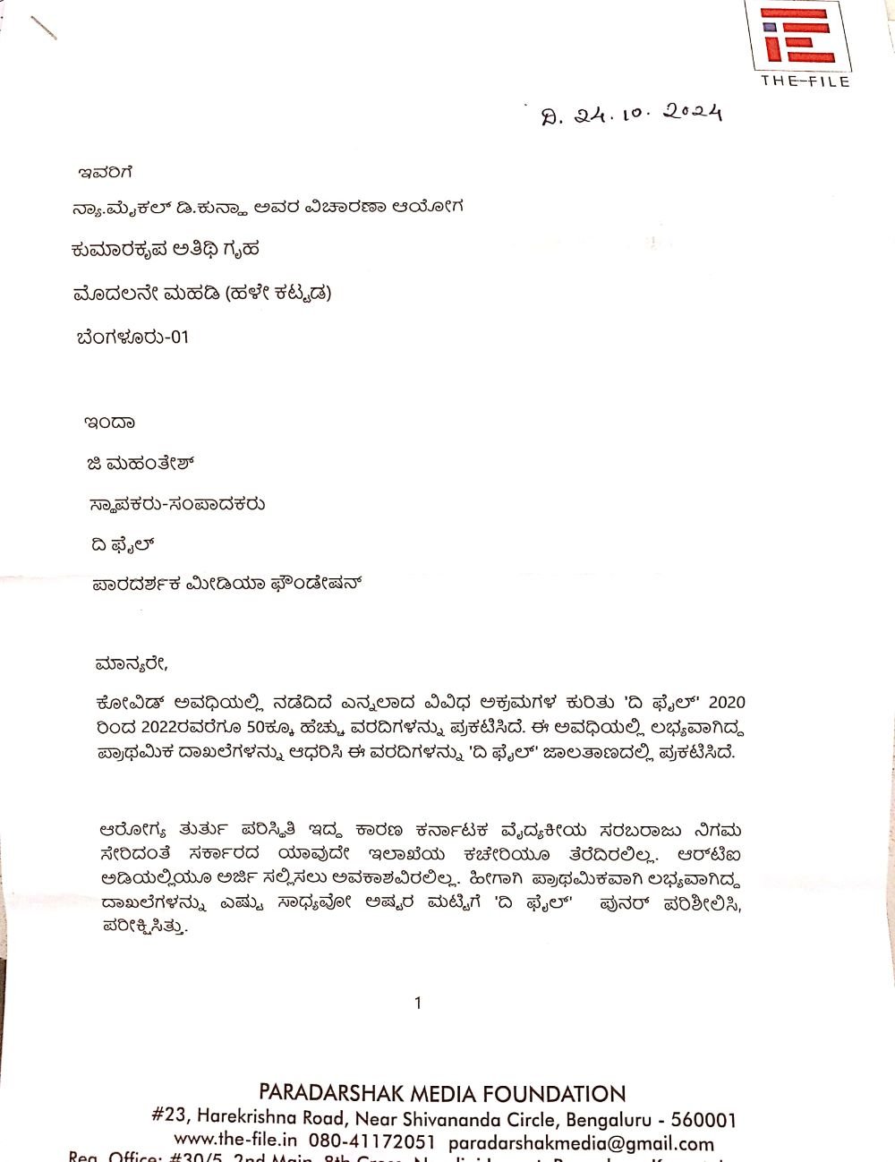 ಬೆಂಗಳೂರು; ಕೋವಿಡ್ ಕಾಲದಲ್ಲಿ ವೈದ್ಯಕೀಯ ಸಲಕರಣೆಗಳ ಖರೀದಿಯಲ್ಲಿ ನಡೆದಿದೆ ಎನ್ನಲಾಗಿರುವ ನಿಯಮಗಳ ಉಲ್ಲಂಘನೆ, ಅವ್ಯವಹಾರ ಸೇರಿದಂತೆ ವಿವಿಧ ರೀತಿಯ ಅಕ್ರಮಗಳ ಕುರಿತು ವಿಚಾರಣೆ ನಡೆಸುತ್ತಿರುವ ಹೈಕೋರ್ಟ್ ನಿವೃತ್ತ ನ್ಯಾಯಾಧೀಶ ಮೈಕಲ್ ಡಿ ಕುನ್ಹಾ ಅವರ ನೇತೃತ್ವದ ಆಯೋಗವು ‘ದಿ ಫೈಲ್’ಗೆ ಸಮನ್ಸ್ ಜಾರಿ ಮಾಡಿದೆ.