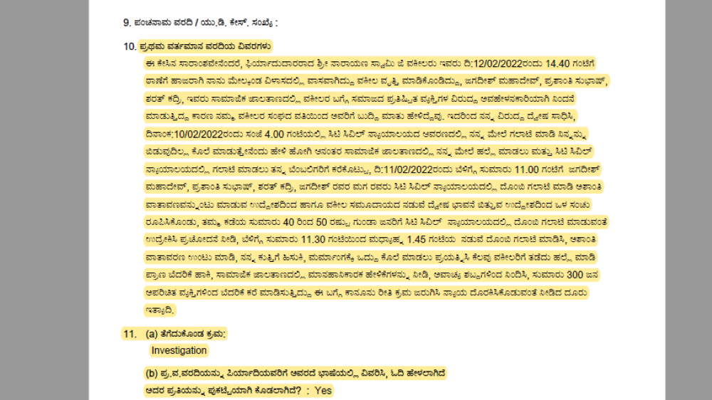 ಮರು ದಿನ ಫೆ.11ರಂದು ಬೆಳಗ್ಗೆ 11 ಗಂಟೆ ಸುಮಾರಿಗೆ ಜಗದೀಶ್ ಮಹದೇವ, ಪ್ರಶಾಂತಿ ಸುಭಾಷ್, ಶರತ್ ಕದ್ರಿ ಮತ್ತಿತರರು ವಕೀಲ ಸಮುದಾಯದ ನಡುವೆ ದ್ವೇಷ ಬಿತ್ತುವ ಒಳಸಂಚು ರೂಪಿಸಿಕೊಂಡು, ಸಿಟಿ ಸಿವಿಲ್ ಕೋರ್ಟ್ ಆರವಣಕ್ಕೆ 40-50 ಗೂಂಡಾಗಳೊಂದಿಗೆ ಬಂದು ಬೆಳಗ್ಗೆ 11.30ರಿಂದ ಮಧ್ಯಾಹ್ನ 1.45ವರೆಗೆ ಗಲಾಟೆ ಮಾಡಿ, ಕೋರ್ಟ್ ಆವರಣದಲ್ಲಿ ಅಶಾಂತಿ ಸೃಷ್ಟಿಸಿದರು.