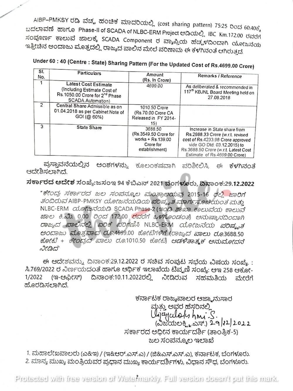 ನಿಯಮ ಉಲ್ಲಂಘಿಸಿರುವ ಅಧಿಕಾರಿಗಳ ವಿರುದ್ಧ ಕ್ರಮ ಕೈಗೊಳ್ಳಬೇಕಿದ್ದ ಜಲಸಂಪನ್ಮೂಲ ಇಲಾಖೆಯು ತರಾತುರಿಯಲ್ಲಿ 4,699.00 ಕೋಟಿ ರು. ಮೊತ್ತದ ಯೋಜನೆಗೆ 2022ರ ಡಿಸೆಂಬರ್ 29ರಂದು ಆಡಳಿತಾತ್ಮಕ ಅನುಮೋದನೆ ನೀಡಿ ಆದೇಶವನ್ನು (ಸರ್ಕಾರದ ಆದೇಶ ಸಂಖ್ಯೆ ಜಸಂಇ 94 ಕೆಬಿಎನ್ 2021 ಬೆಂಗಳೂರು ದಿನಾಂಕ 29.12.2022) ಹೊರಡಿಸಿದೆ. ಇದರ ಪ್ರತಿಯು ‘ದಿ ಫೈಲ್’ಗೆ ಲಭ್ಯವಾಗಿದೆ.