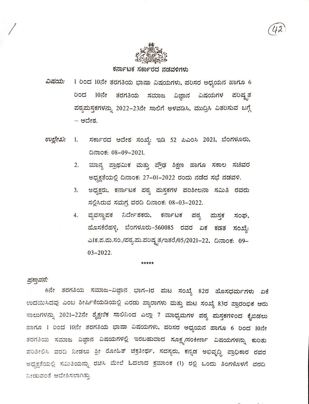 6ರಿಂದ 10ನೇ ತರಗತಿಯ ಸಮಾಜ ವಿಜ್ಞಾನ ವಿಷಯದ ಕನ್ನಡ ಹಾಗೂ ಆಂಗ್ಲ ಮಾಧ್ಯಮ, ಕನ್ನಡ ಮತ್ತು ಆಂಗ್ಲ ಮಾಧ್ಯಮದಲ್ಲಿ ಪರಿಷ್ಕರಿಸಿರುವ ಇತರೆ 5 ಮಾಧ್ಯಮಗಳಲ್ಲಿ (ಉರ್ದು, ತಮಿಳು, ತೆಲುಗು, ಮರಾಠಿ ಹಾಗೂ ಹಿಂದೆ) ಅನುವಾದಿಸಿ, ಅನುವಾದ ಕಾರ್ಯ ಮುಗಿದ ನಂತರ 2022-23ನೇ ಸಾಲಿನಿಂದಲೇ ಮುದ್ರಿಸಿ ವಿತರಿಸಬೇಕು ಎಂದು ಆದೇಶ ಹೊರಡಿಸಿದೆ.