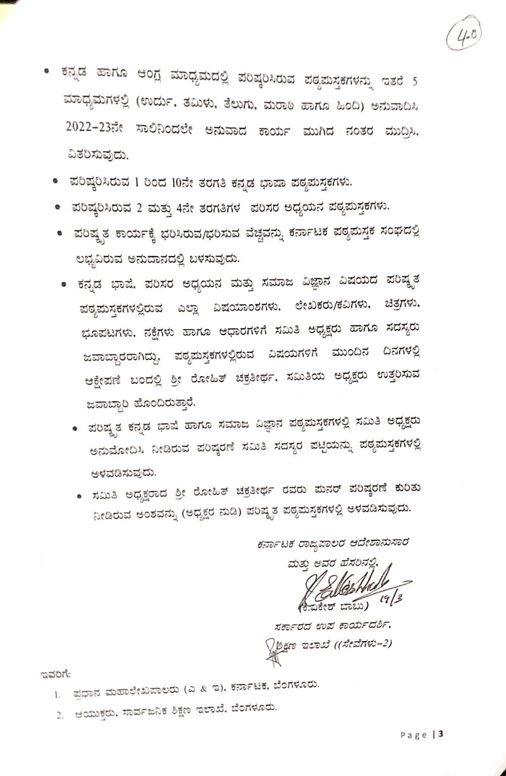 ‘ಕನ್ನಡ ಭಾಷೆ, ಪರಿಸರ ಅಧ್ಯಯನ ಮತ್ತು ಸಮಾಜ ವಿಜ್ಞಾನ ವಿಷಯದ ಪರಿಷ್ಕೃತ ಪಠ್ಯಪುಸ್ತಕಗಳಲ್ಲಿರುವ ಎಲ್ಲಾ ವಿಷಯಗಳು, ಲೇಖಕರು, ಕವಿಗಳು, ಚಿತ್ರಗಳು, ಭೂಪಟಗಳು, ನಕ್ಷೆಗಳು ಹಾಗೂ ಆಧಾರಗಳಿಗೆ ಸಮಿತಿ ಅಧ್ಯಕ್ಷರು ಮತ್ತು ಸದಸ್ಯರು ಜವಾಬ್ದಾರರಾಗಿದ್ದಾರೆ. ಪಠ್ಯಪುಸ್ತಕಗಳಲ್ಲಿರುವ ವಿಷಯಗಳಿಗೆ ಮುಂದಿನ ದಿನಗಳಲ್ಲಿ ಆಕ್ಷೇಪಣೆ ಬಂದಲ್ಲಿ ಸಮಿತಿಯ ಅಧ್ಯಕ್ಷ ರೋಹಿತ್ ಚಕ್ರತೀರ್ಥ ಅವರು ಉತ್ತರಿಸುವ ಜವಾಬ್ದಾರಿ ಹೊಂದಿರುತ್ತಾರೆ. ಪುನರ್ ಪರಿಷ್ಕರಣೆ ಕುರಿತು ನೀಡಿರುವ ಅಂಶವನ್ನು ಮತ್ತು ಸಮಿತಿಯ ಅಧ್ಯಕ್ಷರ ನುಡಿಯನ್ನು ಪರಿಷ್ಕೃತ ಪಠ್ಯಪುಸ್ತಕಗಳಲ್ಲಿ ಅಳವಡಿಸಬೇಕು,’ ಎಂದು ಆದೇಶದಲ್ಲಿ ಹೇಳಲಾಗಿದೆ.