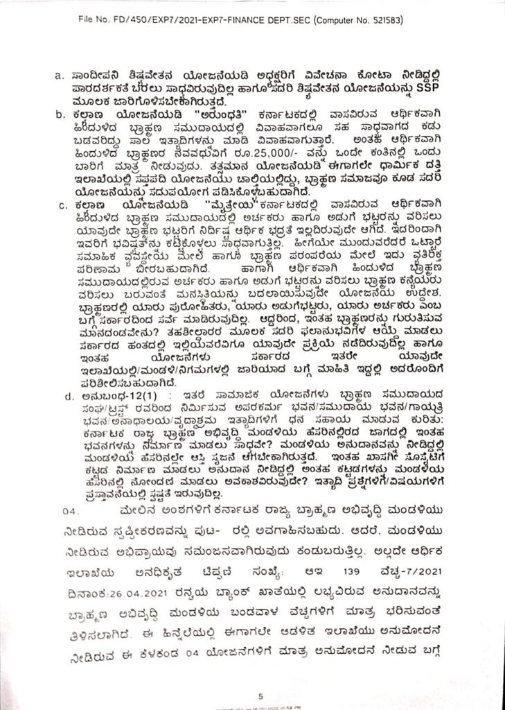 ಬ್ರಾಹ್ಮಣ ಮಂಡಳಿಯು ನೀಡಿದ್ದ ಸ್ಪಷ್ಟೀಕರಣವನ್ನು ಪರಿಶೀಲಿಸಿದ್ದ ಆರ್ಥಿಕ ಇಲಾಖೆಯು ‘ಮಂಡ ಳಿಯು ನೀಡಿರುವ ಅಭಿಪ್ರಾಯವು ಸಮಂಜಸವಾಗಿರುವುದು ಕಂಡು ಬರುತ್ತಿಲ್ಲ. ಅಲ್ಲದೆ ಆರ್ಥಿಕ ಇಲಾಖೆಯ ಅನಧಿಕೃತ ಟಿಪ್ಪಣಿ (ಸಂಖ್ಯೆ ಆಇ 139 ವೆಚ್ಚ-7/2021 ದಿನಾಂಕ 26-04-2021) ಅನ್ವಯ ಬ್ಯಾಂಕ್ ಖಾತೆಯಲ್ಲಿ ಲಭ್ಯವಿರುವ ಅನುದಾನವನ್ನು ಬ್ರಾಹ್ಮಣ ಅಭಿವೃದ್ಧಿ ಮಂಡಳಿಯ ಬಂಡವಾಳ ವೆಚ್ಚಗಳಿಗೆ ಮಾತ್ರ ಭರಿಸಬೇಕು ಎಂದು ತಿಳಿಸಿತ್ತು,’ ಎಂಬುದು ಟಿಪ್ಪಣಿ ಹಾಳೆಯಿಂದ ತಿಳಿದು ಬಂದಿದೆ.