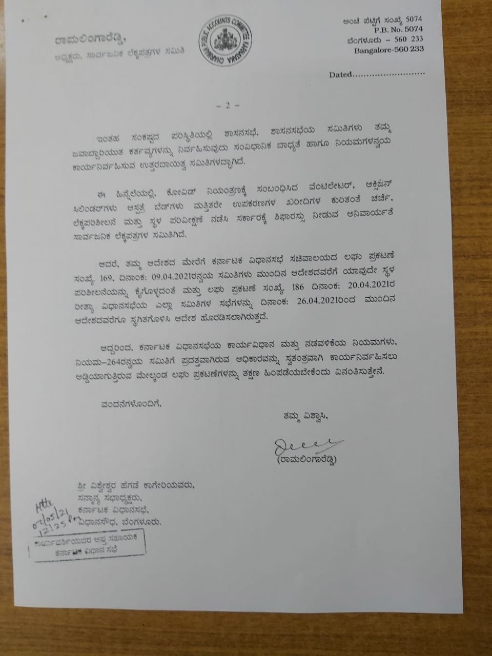 ಈಗಾಗಲೇ ಎಲ್ಲಾ ಸಮಿತಿಗಳ ಸಭೆಗಳನ್ನು ಮುಂದಿನ ಆದೇಶದವರೆಗೂ ಸ್ಥಗಿತಗೊಳಿಸಿ ಹೊರಡಿಸಿರುವ ಆದೇಶ ಮತ್ತು ಹೊರಡಿಸಿರುವ ಲಘು ಪ್ರಕಟಣೆಯನ್ನು ಹಿಂಪಡೆಯಬೇಕು ಎಂದು ಸಾರ್ವಜನಿಕ ಲೆಕ್ಕಪತ್ರಗಳ ಸಮಿತಿ ಅಧ್ಯಕ್ಷ ರಾಮಲಿಂಗಾರೆಡ್ಡಿ ಅವರು ವಿಧಾನಸಭೆ ಸ್ಪೀಕರ್‌ ವಿಶ್ವೇಶ್ವರ ಹೆಗಡೆ ಕಾಗೇರಿ ಅವರಿಗೆ 2021ರ ಮೇ 6 ರಂದು ಪತ್ರ ಬರೆದಿದ್ದಾರೆ. ಈ ಪತ್ರದ ಪ್ರತಿ ‘ದಿ ಫೈಲ್‌’ಗೆ ಲಭ್ಯವಾಗಿದೆ.