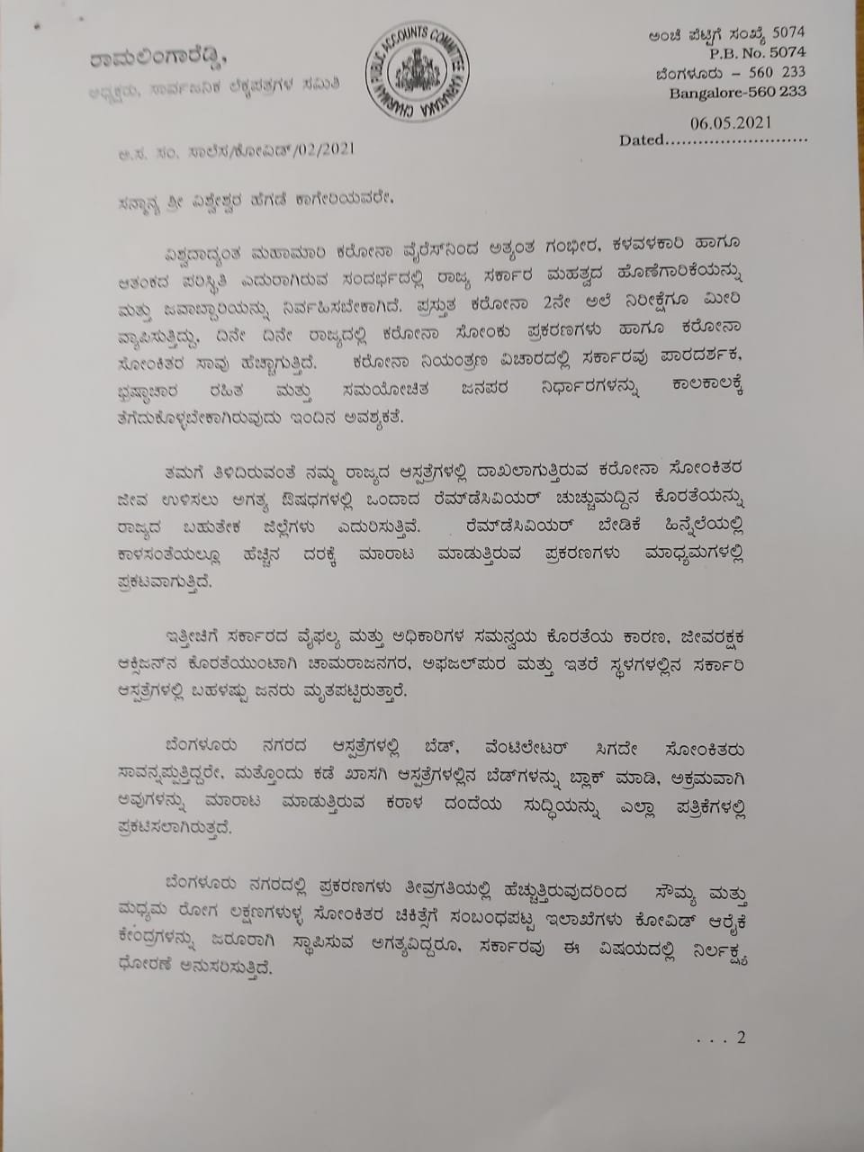 ‘ಕೋವಿಡ್‌ ನಿಯಂತ್ರಣಕ್ಕೆ ಸಂಬಂಧಿಸಿದ ವೆಂಟಿಲೇಟರ್‌, ಆಕ್ಸಿಜನ್‌ ಸಿಲಿಂಡರ್‌ಗಳು, ಆಸ್ಪತ್ರೆ ಬೆಡ್‌ಗಳು ಮತ್ತಿತರೆ ಉಪಕರಣಗಳ ಖರೀದಿಗಳ ಕುರಿತಂತೆ ಚರ್ಚೆ, ಲೆಕ್ಕಪರಿಶೀಲನೆ ಮತ್ತು ಸ್ಥಳ ಪರಿವೀಕ್ಷಣೆ ನಡೆಸಿ ಸರ್ಕಾರಕ್ಕೆ ಶಿಫಾರಸ್ಸು ಮಾಡುವ ಅನಿವಾರ್ಯತೆ ಸಾರ್ವಜನಿಕ ಲೆಕ್ಕಪತ್ರಗಳ ಸಮಿತಿಗಿದೆ,’ ಎಂದು ಪತ್ರದಲ್ಲಿ ರಾಮಲಿಂಗಾರೆಡ್ಡಿ ಅವರು ಪ್ರಸ್ತಾಪಿಸಿದ್ದಾರೆ.