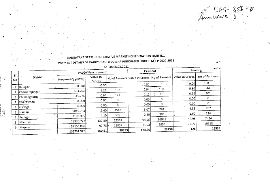 2021ರ ಮಾರ್ಚ್ 6ರ ಅಂತ್ಯಕ್ಕೆ 159854.917 ಮೆಟ್ರಿಕ್ ಟನ್ ಭತ್ತವನ್ನು ರೈತರಿಂದ ಖರೀದಿಸಿದೆ. ಕರ್ನಾಟಕ ಆಹಾರ ನಾಗರಿಕ ಸರಬರಾಜು ನಿಗಮ, ಹಾಗೂ ಕರ್ನಾಟಕ ರಾಜ್ಯ ಸಹಕಾರ ಮಾರಾಟ ಮಹಾಮಂಡಳಗಳಿಂದ ಒಟ್ಟು 162.57 ಕೋಟಿ ರು. ರೈತರಿಗೆ ಪಾವತಿಯಾಗಿದೆ. ಅಲ್ಲದೆ 2018-19ನೇ ಸಾಲಿನಲ್ಲಿ ಕನಿಷ್ಠ ಬೆಂಬಲ ಬೆಲೆ ಯೋಜನೆಯಡಿ ಖರೀದಿಸಿರುವ ಭತ್ತಕ್ಕೆ ಸಂಬಂಧಿಸಿದಂತೆ ಡ್ರೈಯೆಜ್ ಶುಲ್ಕ ಪಾವತಿಸುವುದನ್ನು ಹೊರತುಪಡಿಸಿ ಉಳಿದ ಪೂರ್ಣ ಮೊತ್ತವನ್ನು ಅಕ್ಕಿ ಗಿರಣಿ ಮಾಲೀಕರಿಗೆ ಪಾವತಿಸಿದೆ ಎಂದು ಗೊತ್ತಾಗಿದೆ.