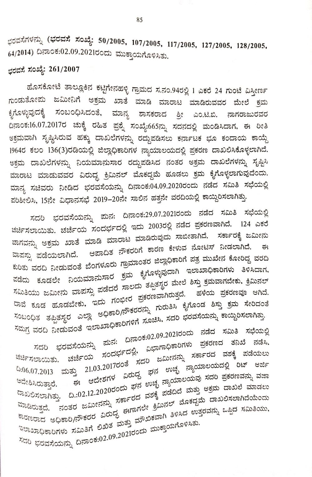 ‘ಖಾಸಗಿ ಬಡಾವಣೆ ಮಾಡಲು ಭೂ ಒತ್ತುವರಿಯಾಗಿರುವುದು ಅಥವಾ ಅನಧಿಕೃತ ಮಳಿಗೆ ತೆರೆಯಲಾಗಿದ್ದರೆ ಅಂತಹವುಗಳನ್ನು ನಿರ್ದಾಕ್ಷ್ಯಿಣ್ಯವಾಗಿ ತೆರವು ಮಾಡಲಾಗುವುದು. ಶೇ. 50ರಷ್ಟು ಅಕ್ರಮ ಭೂ ಒತ್ತುವರಿ ತೆರವು ಮಾಡಲಾಗಿದೆಯೆಂದು ಇಲಾಖಾಧಿಕಾರಿಗಳು ಸಮಿತಿಗೆ ಲಿಖಿತ ಮತ್ತು ಮೌಖಿಕವಾಗಿ ತಿಳಿಸಿದ್ದನ್ನು ಸಮಿತಿಯು ಚರ್ಚಿಸಿದೆ. ಬಾಕಿ ಇರುವ ಅಕ್ರಮ ಭೂ ಒತ್ತುವರಿಯನ್ನು ಕಾಲಮಿತಿಯೊಳಗೆ ತೆರವುಗೊಳಿಸಲು ಕ್ರಮ ವಹಿಸಬೇಕು ಎಂದು ಸೂಚಿಸಿ ಈ ಎಲ್ಲಾ ಭರವಸೆಗಳನ್ನು 2021ರ ಸೆ.9ರ 2ರಂದು ಮುಕ್ತಾಯಗೊಳಿಸಿತು,’ ಎಂದು ವರದಿಯಲ್ಲಿ ಉಲ್ಲೇಖಿಸಲಾಗಿದೆ.