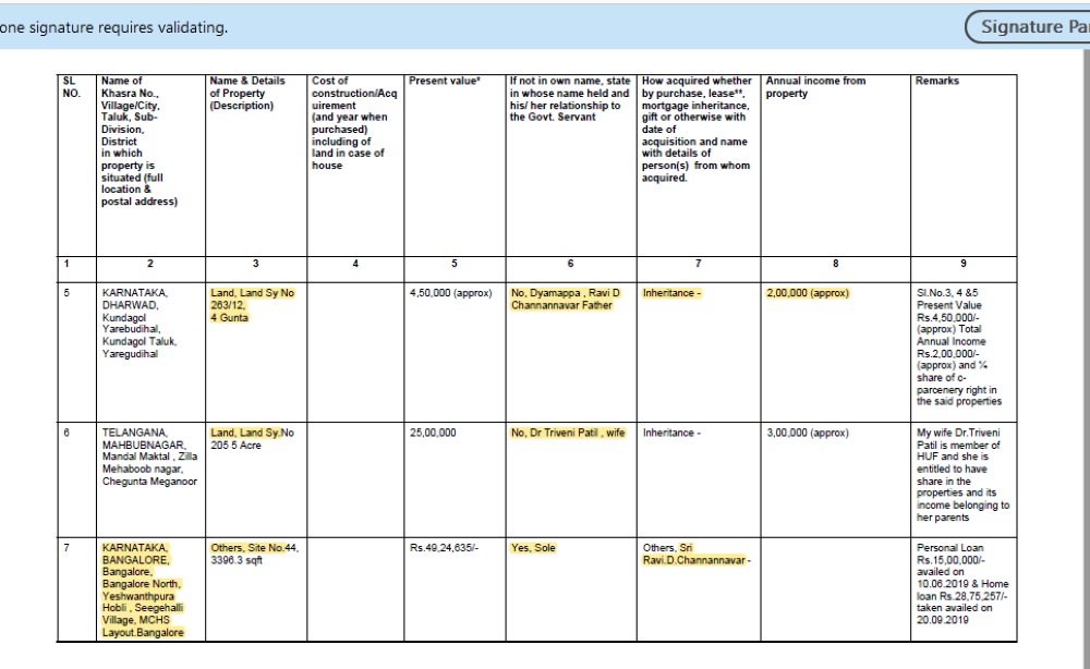 2019, 2020, 2021ನೇ ಸಾಲಿನ ಅಂತ್ಯಕ್ಕೆ ಹೊಂದಿದ್ದ ಸ್ಥಿರಾಸ್ತಿ ವಿವರಗಳಿಗೆ ಸಂಬಂಧಿಸಿದಂತೆ ಯಾವುದೇ ಬದಲಾವಣೆ ಇರಲಿಲ್ಲ. 2019ನೇ ಸಾಲಿಗೆ ಸಂಬಂಧಿಸಿದಂತೆ 2020ರಲ್ಲಿ ಸಲ್ಲಿಸಿದ್ದ ಆಸ್ತಿದಾಯಿತ್ವ ಪಟ್ಟಿಯಲ್ಲಿದ್ದ ವಿವರಗಳನ್ನೇ 2021ರ ಜನವರಿ 25ರಂದು ಘೋಷಿಸಿದ್ದರು ಎಂಬುದು ಕೇಂದ್ರ ಸರ್ಕಾರಕ್ಕೆ ಸಲ್ಲಿಸಿರುವ ಆಸ್ತಿ ದಾಯಿತ್ವ ಪಟ್ಟಿಯಿಂದ ತಿಳಿದು ಬಂದಿದೆ.
