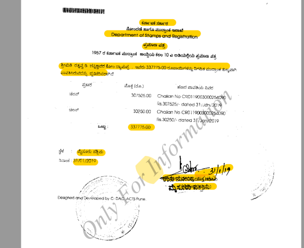 ಮೈಸೂರು ತಾಲೂಕಿನಲ್ಲಿ ಖರೀದಿಸಿರುವ ಜಮೀನಿನ ದಾಖಲೆಗಳನ್ನು ಭೂ ದಾಖಲೆಗಳ ಇಲಾಖೆಯ ಅಧಿಕೃತ ಜಾಲತಾಣ (ಭೂಮಿ) ಮತ್ತು ಮೈಸೂರಿನ ಪಶ್ಚಿಮ ಉಪ ನೋಂದಾಣಾಧಿಕಾರಿಗಳ ಕಚೇರಿಯಲ್ಲಿ ನೋಂದಾಯಿಸಿರುವ ಸ್ಥಿರ ಸ್ವತ್ತಿನ ಶುದ್ಧ ಕ್ರಯಪತ್ರವನ್ನು ಪಡೆದುಕೊಂಡಿದೆ.