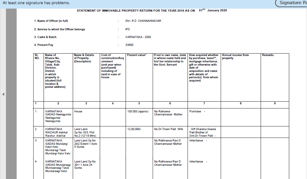 ಕೇಂದ್ರ ಸರ್ಕಾರದ ಅಧಿಕೃತ ಜಾಲತಾಣಕ್ಕೆ ರವಿ ಡಿ ಚನ್ನಣ್ಣನವರ್ ಅವರು ಅಪ್ಲೋಡ್ ಮಾಡಿರುವ ಮೂರು ವರ್ಷಗಳ ಆಸ್ತಿ ದಾಯಿತ್ವ ಪಟ್ಟಿ ಮತ್ತು ಅವರ ತಾಯಿ ರತ್ನವ್ವ ಚನ್ನಣ್ಣನವರ್ ಅವರು ಮೈಸೂರು ತಾಲೂಕಿನಲ್ಲಿ ಖರೀದಿಸಿರುವ ಜಮೀನಿಗೆ ಸಂಬಂಧಿಸಿದ ಆರ್ಟಿಸಿ, ತಿಳಿವಳಿಕೆ ಚೀಟಿ, ಮ್ಯುಟೇಷನ್ ಆದೇಶ, ಸ್ಥಿರ ಸ್ವತ್ತಿನ ಶುದ್ದ ಕ್ರಯಪತ್ರದ ಪ್ರತಿಗಳು ‘ದಿ ಫೈಲ್’ಗೆ ಲಭ್ಯವಾಗಿದೆ.