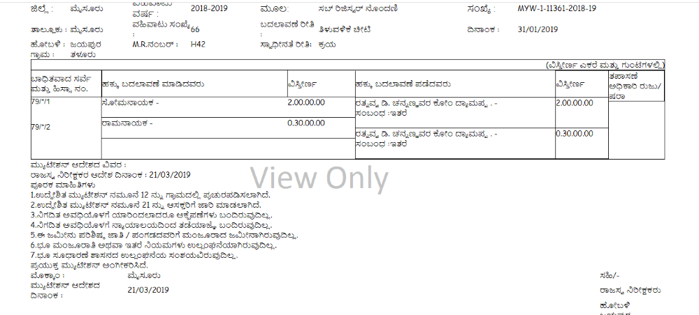 ಈ ಮ್ಯುಟೇಷನ್ ಆದೇಶವನ್ನು ರಾಜಸ್ವ ನಿರೀಕ್ಷಕರ ಆದೇಶದಂತೆ 2019ರ ಮಾರ್ಚ್ 2019ರಂದು ಹೊರಡಿಸಲಾಗಿದೆ. ಉದ್ದೇಶಿತ ಮ್ಯುಟೇಷನ್ ನಮೂನೆ 12ನ್ನು ಗ್ರಾಮದಲ್ಲಿ ಪ್ರಚುರಪಡಿಸಲಾಗಿತ್ತು. ನಮೂನೆ 21ರನ್ನು ಆಸಕ್ತರಿಗೆ ಜಾರಿ ಮಾಡಲಾಗಿತ್ತು. ನಿಗದಿತ ಅವಧಿಯೊಳಗೆ ಯಾರಿಂದಲೂ ಆಕ್ಷೇಪಣೆ ಬಂದಿಲ್ಲ. ಅಲ್ಲದೆ ನ್ಯಾಯಾಲಯದಿಂದ ತಡೆಯಾಜ್ಞೆಯೂ ಬಂದಿಲ್ಲ. ಈ ಜಮೀನು ಪರಿಶಿಷ್ಟ ಜಾತಿ ಮತ್ತು ಪಂಗಡದವರಿಗೆ ಮಂಜೂರಾದ ಜಮೀನಾಗಿರುವುದಿಲ್ಲ. ಭೂ ಮಂಜೂರಾತಿ ಅಥವಾ ಇತರೆ ನಿಯಮಗಳು ಉಲ್ಲಂಘನೆ ಆಗಿರುವುದಿಲ್ಲ. ಭೂ ಸುಧಾರಣೆ ಶಾಸನದ ಉಲ್ಲಂಘನೆಯ ಸಂಶಯವಿರುವುದಿಲ್ಲ ಎಂದು ಮ್ಯುಟೇಷನ್ ಆದೇಶದಲ್ಲಿ ಹೇಳಲಾಗಿದೆ.