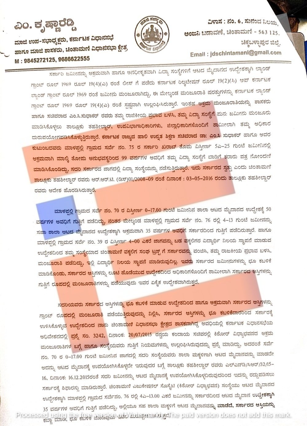 ಚಿಂತಾಮಣಿ ವಿಧಾನಸಭೆ ಕ್ಷೇತ್ರದ ಮಾಜಿ ಶಾಸಕ ಎಂ ಕೃಷ್ಣಾರೆಡ್ಡಿ ಅವರು ಈ ಸಂಬಂಧ 2024ರ ಅಕ್ಟೋಬರ್ 14ರಂದೇ ಕಂದಾಯ ಇಲಾಖೆಯ ಸರ್ಕಾರದ ಪ್ರಧಾನ ಕಾರ್ಯದರ್ಶಿಗೆ ಲಿಖಿತ ದೂರು ಸಲ್ಲಿಸಿದ್ದಾರೆ. ಈ ದೂರಿನ ಪ್ರತಿಯು ‘ದಿ ಫೈಲ್’ಗೆ ಲಭ್ಯವಾಗಿದೆ.