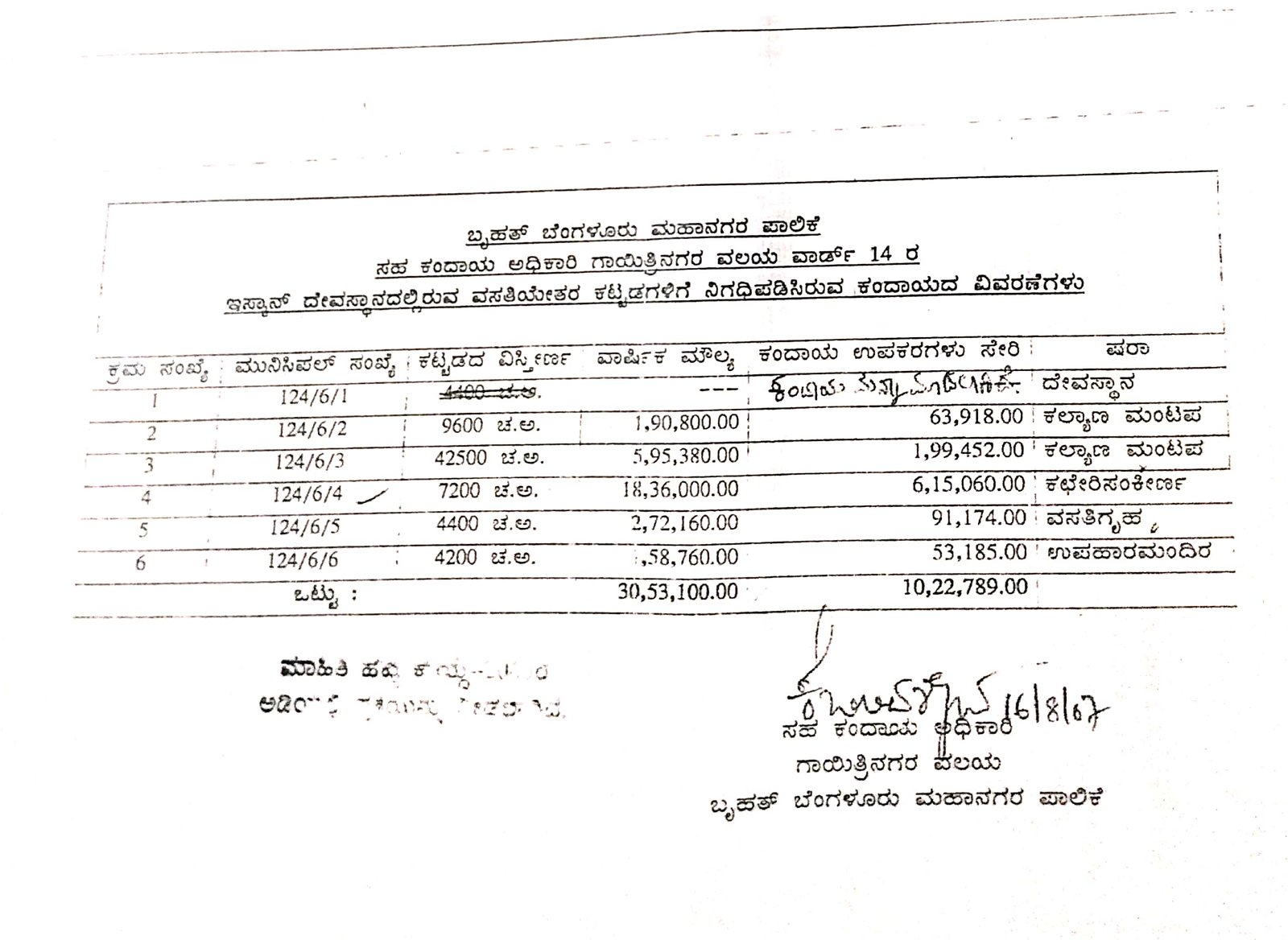 ರಾಜಾಜಿನಗರದಲ್ಲಿರುವ ಇಸ್ಕಾನ್ ಕಟ್ಟಡಕ್ಕೆ ಕೆಎಂಸಿ ಕಾಯ್ದೆ 1976ರ ಕಕಲಂ (110ಬಿ) ಅಡಿಯಲ್ಲಿ ಸೇವಾ ಶುಲ್ಕ ನಿಗದಿಪಡಿಸಿದೆ. ಅಲ್ಲದೆ 14 ವರ್ಷದ ಹಿಂದೆಯೇ ಅಂದರೆ 2007ರಲ್ಲಿ ಅಂದಿನ ಸರ್ಕಾರ ಇಸ್ಕಾನ್ನ ಎಲ್ಲಾ ಕಟ್ಟಡಗಳಿಗೂ ಉಪ ಸಂಖ್ಯೆ ನೀಡಿ ಕಂದಾಯವನ್ನು ನಿಗದಿಪಡಿಸಿತ್ತು. ಕಲ್ಯಾಣ ಮಂಟಪ, ಕಚೇರಿ ಸಂಕೀರ್ಣ, ವಸತಿ ಗೃಹ ಮತ್ತು ಉಪಹಾರ ಮಂದಿರ (ಒಟ್ಟು 67,900 ಚ ಅಡಿ ವಿಸ್ತೀರ್ಣ)ದ ಒಟ್ಟು ವಿಸ್ತೀರ್ಣಕ್ಕೆ 30,53,100 ರು.ಗಳನ್ನು ವಾರ್ಷಿಕ ಮೌಲ್ಯ ಮತ್ತು 10,22,789 ರು. ಆಸ್ತಿ ತೆರಿಗೆ, ಇತರೆ ಉಪ ಕರವೆಂದು ನಿಗದಿಪಡಿಸಿತ್ತು.