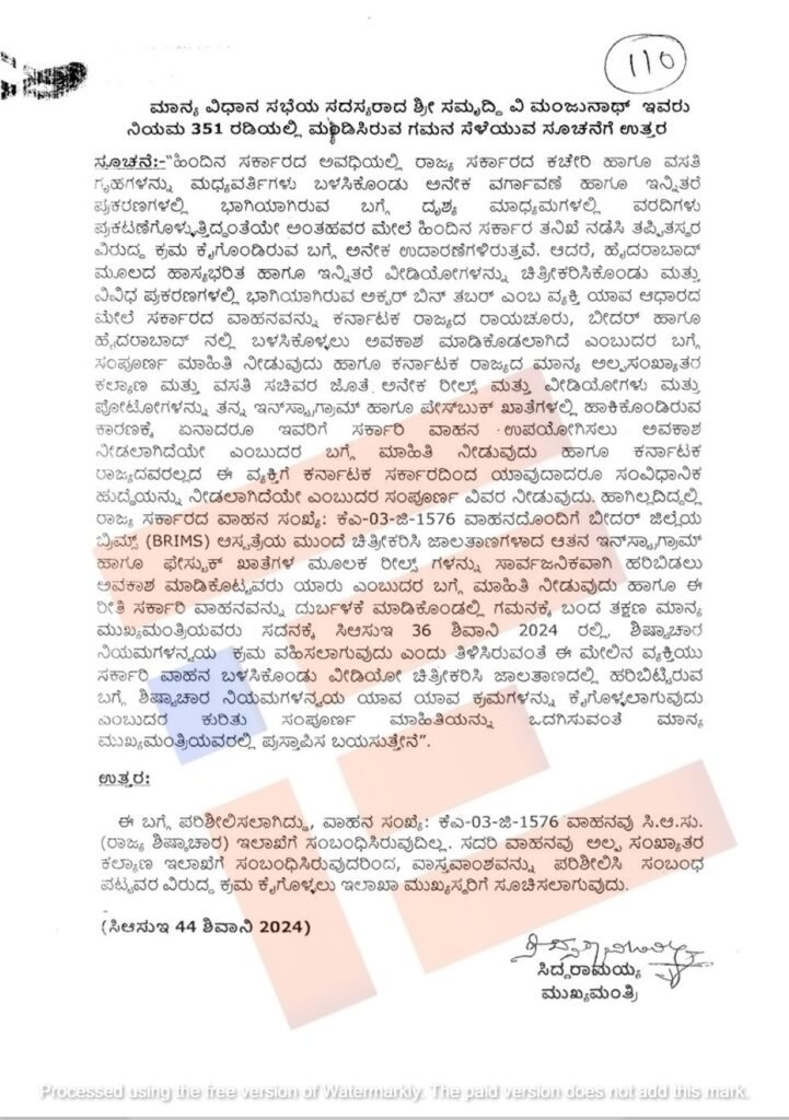 ‘ಈ ಬಗ್ಗೆ ಪರಿಶೀಲಿಸಲಾಗಿದ್ದು ವಾಹನ ಸಂಖ್ಯೆ ಕೆಎ-03-ಜಿ-1576 ವಾಹನವು ಸಿಆಸುಇ (ರಾಜ್ಯ ಶಿಷ್ಟಾಚಾರ) ಇಲಾಖೆಗೆ ಸಂಬಂಧಿಸಿರುವುದಿಲ್ಲ. ಸದರಿ ವಾಹನವು ಅಲ್ಪಸಂಖ್ಯಾತರ ಕಲ್ಯಾಣ ಇಲಾಖೆಗೆ ಸಂಬಂಧಿಸಿರುವುದರಿಂದ ವಾಸ್ತವಾಂಶವನ್ನು ಪರಿಶೀಲಿಸಿ ಸಂಬಂಧಪಟ್ಟವರ ವಿರುದ್ಧ ಕ್ರಮ ಕೈಗೊಳ್ಳಲು ಇಲಾಖಾ ಮುಖ್ಯಸ್ಥರಿಗೆ ಸೂಚಿಸಲಾಗುವುದು,’ ಎಂದು ಮುಖ್ಯಮಂತ್ರಿ ಸಿದ್ದರಾಮಯ್ಯ ಅವರು ಉತ್ತರಿಸಿದ್ದಾರೆ.