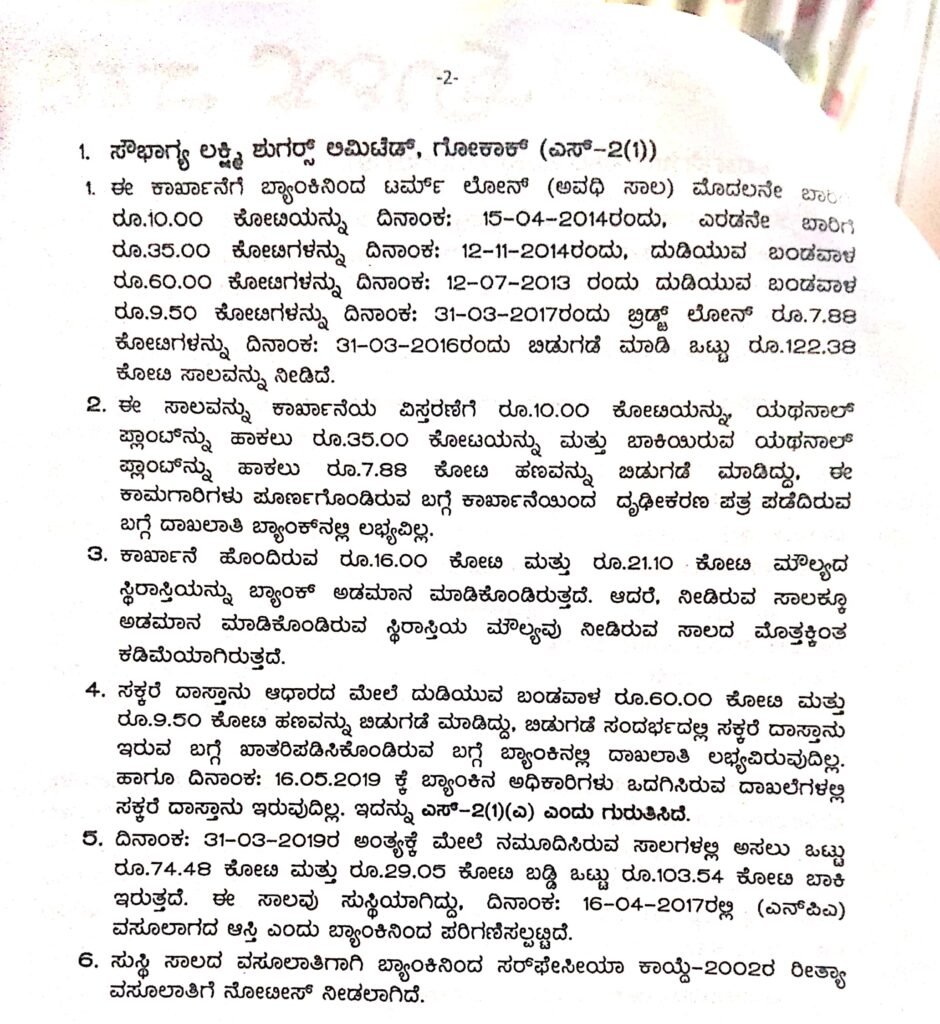 ಈ ಕಾರ್ಖಾನೆ ವಿವಿಧ ಉದ್ದೇಶಗಳ ಹೆಸರಿನಲ್ಲಿ ಪಡೆದಿರುವ ಸಾಲಗಳಲ್ಲಿ 2019ರ ಮಾರ್ಚ್ 31ರ ಅಂತ್ಯಕ್ಕೆ ಅಸಲು ಒಟ್ಟು 74.48 ಕೋಟಿ ರು., 29.05 ಕೋಟಿ ರು. ಬಡ್ಡಿ ಸೇರಿ ಒಟ್ಟು 103.54 ಕೋಟಿ ರು.ಬಾಕಿ ಇದೆ. ಆದರೆ ಈ ಸಾಲ ಸುಸ್ತಿಯಾಗಿದೆಯಲ್ಲದೆ 2017ರ ಏಪ್ರಿಲ್ 16ರಂದೇ ಇದು ವಸೂಲಾಗದ ಆಸ್ತಿ(ಎನ್ಪಿಎ) ಎಂದು ಬ್ಯಾಂಕ್ ಪರಿಗಣಿಸಿದೆ.