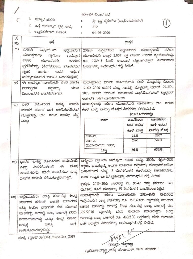 2020ರ ಮಾರ್ಚ್ 18ರಂದು ನಡೆದ ಅಧಿವೇಶನದಲ್ಲಿ ಸಿ ಎನ್ ಬಾಲಕೃಷ್ಣ ಅವರು ಕೇಳಿದ ಚುಕ್ಕೆ ಗುರುತಿಲ್ಲದ ಪ್ರಶ್ನೆಗೆ ಉತ್ತರಿಸಿರುವ ಸಚಿವ ಈಶ್ವರಪ್ಪ ಅವರು ಬಾಕಿ ಉಳಿಸಿಕೊಂಡಿರುವ ಹಣವನ್ನು ಬಿಡುಗಡೆಗೊಳಿಸಬೇಕು ಎಂದು 2020ರ ಮಾರ್ಚ್ 6ರಂದು ಕೇಂದ್ರ ಸರ್ಕಾರಕ್ಕೆ ಪತ್ರ ಬರೆಯಲಾಗಿದೆ ಎಂದು ತಿಳಿಸಿದ್ದಾರೆ.