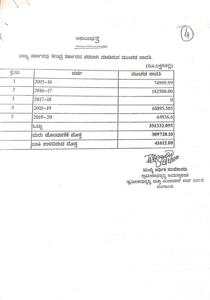 ರಾಜ್ಯ ಸರ್ಕಾರವು ಈಗಾಗಲೇ ಕೇಂದ್ರ ಸರ್ಕಾರದ ಪರವಾಗಿ 2015-16ರಿಂದ 2019-20ವರೆಗೆ ಒಟ್ಟು 351332.095 ಲಕ್ಷ ರು.ಗಳನ್ನು ಪಾವತಿಸಿದೆ. ಇದರಲ್ಲಿ 41612.00 ಲಕ್ಷ ರು.ಗಳು ಇನ್ನೂ ಬಾಕಿ ಇದೆ ಎಂಬ ಅಂಶ ದಾಖಲೆಯಿಂದ ತಿಳಿದು ಬಂದಿದೆ.