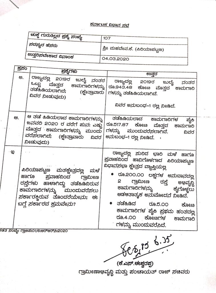 ಜೆಡಿಎಸ್-ಕಾಂಗ್ರೆಸ್ ಸಮ್ಮಿಶ್ರ ಸರ್ಕಾರದ ಅಧಿಕಾರಾವಧಿಯಲ್ಲಿ ರಾಜ್ಯದ ವಿವಿಧ ಜಿಲ್ಲೆಗಳಿಗೆ ಮಂಜೂರಾಗಿದ್ದ ಒಟ್ಟು ಮೊತ್ತದ ಪೈಕಿ 943.48 ಕೋಟಿ ರು. ಮೊತ್ತದ ಕಾಮಗಾರಿಗಳಿಗೆ ಬಿಜೆಪಿ ಸರ್ಕಾರ ತಡೆಯೊಡ್ಡಿತ್ತು ಎಂದು ಕೆ ಎಸ್ ಈಶ್ವರಪ್ಪ ಅವರು ಸದನದಲ್ಲಿ ಲಿಖಿತ ಉತ್ತರ ನೀಡುವ ಮೂಲಕ ಒಪ್ಪಿಕೊಂಡಿದ್ದಾರೆ.