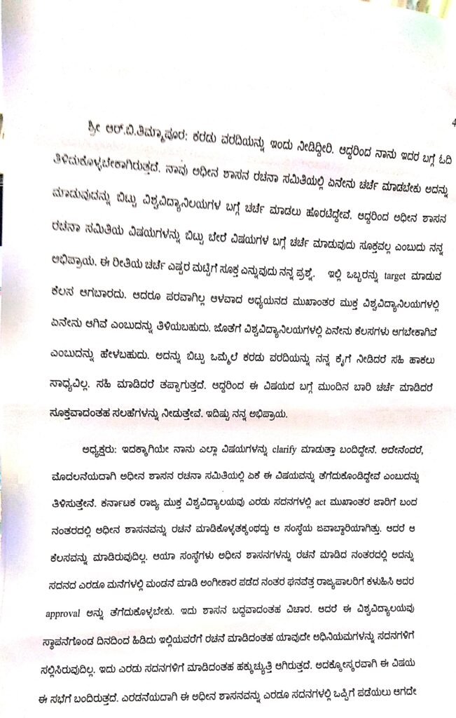 ಹಾಗೆಯೇ ‘ವಿಶ್ವವಿದ್ಯಾಲಯಗಳಲ್ಲಿ ಅಧ್ಯಾಪಕರು ಮತ್ತು ಕುಲಪತಿಗಳು ಏನು  ಮಾಡಿದ್ದಾರೆಂದು ಚರ್ಚಿಸಲು ಈ ಸಮಿತಿಯನ್ನು ಮಾಡಿಲ್ಲ,’ ಎಂದು ಚರ್ಚೆ ವೇಳೆಯಲ್ಲಿ ತಮ್ಮ ಅಭಿಪ್ರಾಯವನ್ನು ದಾಖಲಿಸಿರುವ ಆರ್‌ ಬಿ ತಿಮ್ಮಾಪೂರ ಅವರು ಯಾವುದೋ ಒಂದು ವಿಶ್ವವಿದ್ಯಾಲಯದ  ಬಗ್ಗೆ  ಅಥವಾ ಕುಲಪತಿಗಳ  ಬಗ್ಗೆ ನಿರ್ದಿಷ್ಟವಾಗಿ ಗಮನಹರಿಸುವುದು ಅಷ್ಟು ಸೂಕ್ತವಲ್ಲ. ಎಲ್ಲಾ  ವಿಶ್ವವಿದ್ಯಾಲಯಗಳನ್ನೂ ಚರ್ಚಾ ವ್ಯಾಪ್ತಿಗೆ ಒಳಪಡಿಸಿದರೆ ಸೂಕ್ತ ಎಂದು ಹೇಳಿರುವುದು  ದಾಖಲೆಯಿಂದ ತಿಳಿದು ಬಂದಿದೆ.