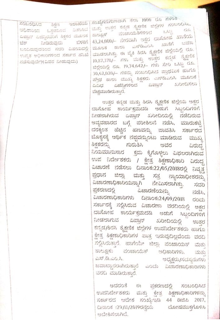 ಪ್ರಕರಣಕ್ಕೆ ಸಂಬಂಧಿಸಿದ ಶಿಕ್ಷಣಾಧಿಕಾರಿ, ಕಾರವಾರ ಜಿಲ್ಲಾ  ಪಂಚಾಯತ್‌ ಹಾಗೂ 11 ತಾಲೂಕುಗಳಲ್ಲಿ   ಕಾರ್ಯನಿರ್ವಹಿಸುತ್ತಿರುವ ಅಕ್ಷರ ದಾಸೋಹ ಕಾರ್ಯಕ್ರಮದ ಸಹಾಯಕ ನಿರ್ದೇಶಕರುಗಳಿಗೆ ಕಾರಣ ಕೇಳುವ ನೋಟೀಸ್‌ ನೀಡಿ ಕೈ ತೊಳೆದುಕೊಂಡಿದೆಯೇ ವಿನಃ ವಿಚಾರಣಾಧಿಕಾರಿ ಒಂದು ವರ್ಷದ ಹಿಂದೆಯೇ ಮಾಡಿರುವ ಶಿಫಾರಸ್ಸು ಆಧರಿಸಿ ಮಾಡಿ ಈವರೆವಿಗೂ ಯಾವ ಕ್ರಮವನ್ನೂ ಕೈಗೊಂಡಿಲ್ಲ ಎಂದು ತಿಳಿದು ಬಂದಿದೆ.