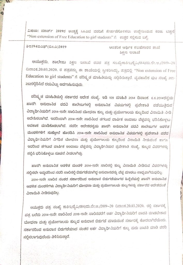 ಖಾಸಗಿ ಅನುದಾನಿತ ಪದವಿ ಕಾಲೇಜುಗಳಲ್ಲಿ ಅನುದಾನಿತ ವಿಷಯಗಳಲ್ಲಿ ಪ್ರವೇಶ ಪಡೆದಿದ್ದ ವಿದ್ಯಾರ್ಥಿನಿಯರಿಗೆ 2014-15ನೇ ಸಾಲಿನಿಂದ ಬೋಧನಾ ಮತ್ತು ಪ್ರಯೋಗಾಲಯ ಶುಲ್ಕದಿಂದ ವಿನಾಯಿತಿ ನೀಡಿ 2014ರ ಜೂನ್ 6ರಂದು ಸರ್ಕಾರ ಆದೇಶ ಹೊರಡಿಸಿತ್ತು.