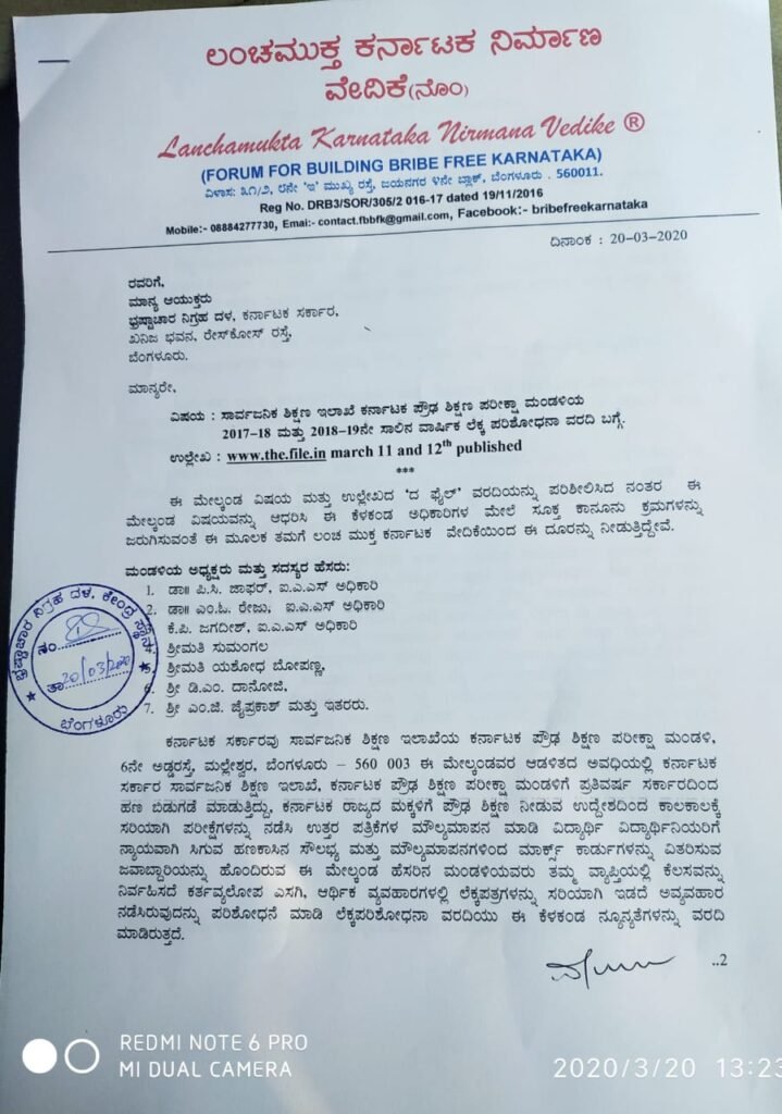 ಕರ್ನಾಟಕ ಪ್ರೌಢಶಿಕ್ಷಣ ಪರೀಕ್ಷಾ ಮಂಡಳಿಯಲ್ಲಿ ನಡೆದಿರುವ ಅವ್ಯವಹಾರಗಳನ್ನು ಲೆಕ್ಕ ಪರಿಶೋಧನಾ ವರದಿ ಆಧರಿಸಿ ‘ದಿ ಫೈಲ್’ ವಿಶೇಷ ವರದಿ ಪ್ರಕಟಿಸಿತ್ತು. ‘ದಿ ಫೈಲ್’ ವರದಿ ಮತ್ತು ಕರ್ನಾಟಕ ರಾಜ್ಯ ಲೆಕ್ಕ ಪರಿಶೋಧನೆ ಇಲಾಖೆಯ ವರದಿ ಆಧರಿಸಿ ಲಂಚಮುಕ್ತ ಕರ್ನಾಟಕ ವೇದಿಕೆಯ ಸಂಘಟನಾ ಕಾರ್ಯದರ್ಶಿ ಎಚ್ ಎಂ ವೆಂಕಟೇಶ್ ಅವರು ಭ್ರಷ್ಟಾಚಾರ ನಿಗ್ರಹ ದಳಕ್ಕೆ ದೂರು ಸಲ್ಲಿಸಿದ್ದಾರೆ.