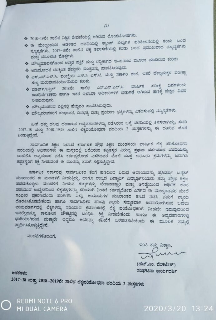 2017-18 ಮತ್ತು 2018-19ನೇ ಸಾಲಿನ ಲೆಕ್ಕ ಪರಿಶೋಧನ ವರದಿಯಲ್ಲಿ ಕರ್ನಾಟಕ ಪ್ರೌಢಶಿಕ್ಷಣ ಪರೀಕ್ಷಾ ಮಂಡಳಿ ಎಸ್ಎಸ್ಎಲ್ಸಿ ವಾರ್ಷಿಕ ಪರೀಕ್ಷೆ ಚಟುವಟಿಕೆಗಳಿಗೆ ಬಿಡುಗಡೆ ಮಾಡಿದ್ದ ಅನುದಾನ, ಮೌಲ್ಯಮಾಪನ ಚಟುವಟಿಕೆ ಸೇರಿದಂತೆ ಇನ್ನಿತರೆ ಚಟುವಟಿಕೆಗಳಲ್ಲಿನ ಲೋಪಗಳನ್ನು ಬಯಲಿಗೆಳೆದಿತ್ತು. ಅಲ್ಲದೆ, ಆರ್ಥಿಕ ಅಶಿಸ್ತು ಮತ್ತು ಆಡಳಿತ ನಿರ್ಲಕ್ಷ್ಯಗಳನ್ನು ಲೆಕ್ಕ ಪರಿಶೋಧನೆ ವರದಿ ಬಹಿರಂಗಗೊಳಿಸಿತ್ತು.