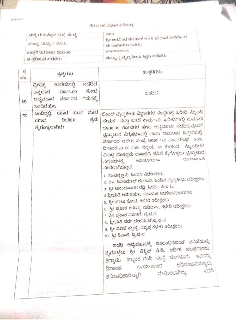 ಬೀದರ್ ವೈದ್ಯಕೀಯ ವಿಜ್ಞಾನಗಳ ಸಂಸ್ಥೆಯಲ್ಲಿ ಖರೀದಿ, ಸಿಬ್ಬಂದಿ ನೇಮಕ ಮತ್ತು ಇತರೆ ಕಾಮಗಾರಿಗಳಲ್ಲಿ ನಡೆದಿದ್ದ ಒಟ್ಟು 18.00 ಕೋಟಿ ರು. ಮೊತ್ತದ ಅವ್ಯವಹಾರಗಳಿಗೆ ಸಂಬಂಧಿಸಿದಂತೆ ಬ್ರಿಮ್ಸ್ ಹಿಂದಿನ ನಿರ್ದೇಶಕ ಡಾ ಚನ್ನಣ್ಣ ಸಿ ಸೇರಿದಂತೆ ಒಟ್ಟು 10 ಮಂದಿ ಅಧಿಕಾರಿ ಸಿಬ್ಬಂದಿ ವಿರುದ್ಧ ವಿಚಾರಣೆಗೆ ಮಂಜೂರಾತಿ ದೊರೆತಿದೆ.