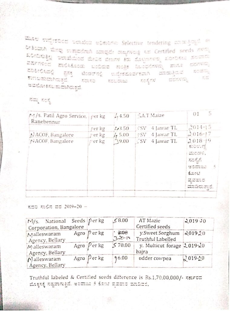 30 ಲಕ್ಷ ರು.ಗಳಲ್ಲಿ ಖರೀದಿಸಬಹುದಾಗಿದ್ದ ಮೇವಿನ ಬೀಜವನ್ನು ಹತ್ತು ಪಟ್ಟು ಹೆಚ್ಚಳ ಇರುವ ದರದಲ್ಲಿ ಖರೀದಿಸಲು ಮುಂದಾಗಿರುವ ಅಧಿಕಾರಿಗಳು, ಸರ್ಕಾರಕ್ಕೆ 5 ಕೋಟಿ ರು. ಅಧಿಕ ಮೊತ್ತದ ಹೊರೆಗೆ ಕಾರಣರಾಗಿದ್ದಾರೆ.  ಏಜೆನ್ಸಿ ಪರ ವಕಾಲತ್ತು ಹಾಕಿರುವ ಕೆಲ ಹಿರಿಯ ಅಧಿಕಾರಿಗಳು, ಮುಕ್ತ ಟೆಂಡರ್‌ಗೆ ಅವಕಾಶ ಕೊಡದೆ ದರ ಗುತ್ತಿಗೆ ಒಪ್ಪಂದಕ್ಕೆ ಅನುಮೋದನೆ ಪಡೆಯುವಲ್ಲಿ ಯಶಸ್ವಿಯಾಗಿದ್ದಾರೆ. ಬೆಂಗಳೂರು ಮೂಲದ ಖಾಸಗಿ ಏಜೆನ್ಸಿ ನೆಪ ಮಾತ್ರಕ್ಕೆ ಗುತ್ತಿಗೆ ಪಡೆದು ವಿದೇಶಿ ಕಂಪನಿಗಳಿಗೆ ಉಪ-ಗುತ್ತಿಗೆ ನೀಡುವ ಸಂಚು ಕೂಡ ಇದರಲ್ಲಿದೆ ಎಂಬ ಆರೋಪ ಕೇಳಿ ಬಂದಿದೆ.