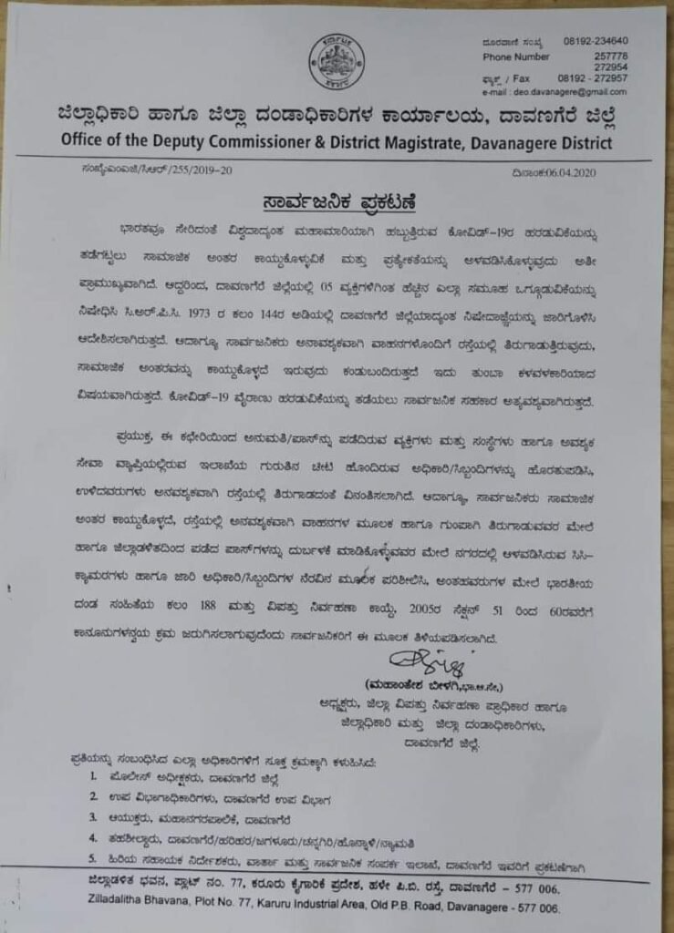 ರಾಜ್ಯದಲ್ಲೆಡೆ ಈಗಾಗಲೇ ನಿಷೇದಾಜ್ಞೆಯನ್ನು ಜಾರಿಗೊಳಿಸಿದ್ದರೂ ಅನಾವಶ್ಯಕವಾಗಿ ರಸ್ತೆಗಿಳಿದಿರುವ ಸಾರ್ವಜನಿಕರು, ಪ್ರಕರಣಗಳ ಸಂಖ್ಯೆ ಹೆಚ್ಚಳಕ್ಕೆ ದಾರಿಮಾಡಿಕೊಡುತ್ತಿದ್ದಾರೆ. ಈ ಬೆಳವಣಿಗೆ ನಡುವೆಯೇ ಸಾಮಾಜಿಕ ಅಂತರ ಕಾಯ್ದುಕೊಳ್ಳುವ ಬಗ್ಗೆ ಸಾರ್ವಜನಿಕ ಪ್ರಕಟಣೆಯನ್ನೂ ಹೊರಡಿಸಿರುವ ದಾವಣಗೆರೆ ಜಿಲ್ಲಾಧಿಕಾರಿ ಮಹಾಂತೇಶ್ ಬೀಳಗಿ ಅವರು ಅಂತರ ಕಾಯ್ದುಕೊಳ್ಳದಿರುವುದು ಕಳವಳಕಾರಿಯಾಗಿದೆ ಎಂದು ಹೇಳಿದ್ದಾರೆ.