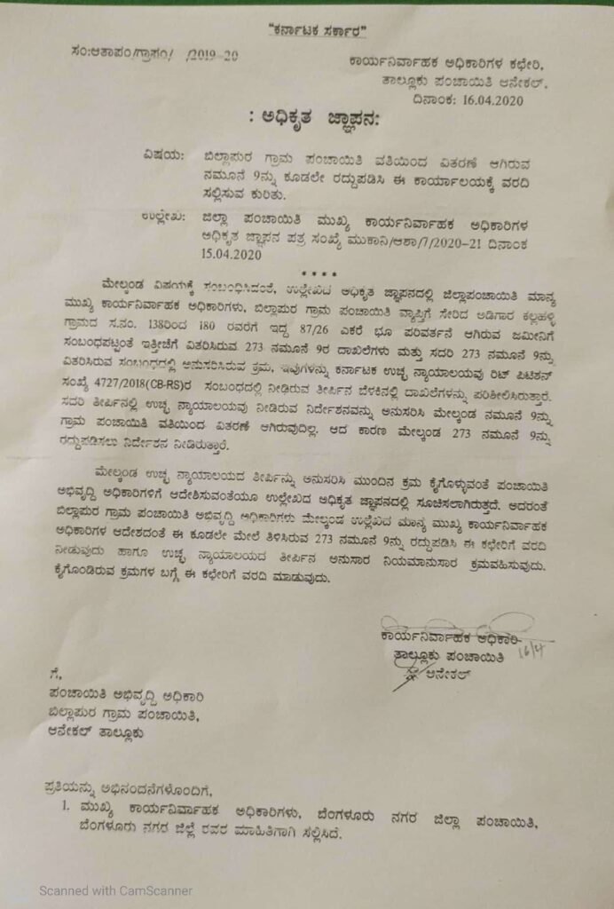 ‘ಉಚ್ಛ ನ್ಯಾಯಾಲಯ ನೀಡಿರುವ ನಿರ್ದೇಶನವನ್ನು ಅನುಸರಿಸಿ ನಮೂನೆ 9 ಗ್ರಾಮ ಪಂಚಾಯ್ತಿಯಿಂದ ವಿತರಣೆ ಆಗಿರುವುದಿಲ್ಲ. ಆದ ಕಾರಣ ಎಲ್ಲಾ 273 ಖಾತೆಗಳನ್ನು ರದ್ದುಪಡಿಸಿ, ತಾಲೂಕು ಪಂಚಾಯ್ತಿ ಕಚೇರಿಗೆ ವರದಿ ಸಲ್ಲಿಸಬೇಕು,’ ಎಂದು ತಾಲೂಕು ಪಂಚಾಯ್ತಿ ಮುಖ್ಯ ಕಾರ್ಯನಿರ್ವಹಣಾಧಿಕಾರಿಗಳು 2020ರ ಏಪ್ರಿಲ್ 16ರಂದು ನಿರ್ದೇಶಿಸಿದ್ದಾರೆ.