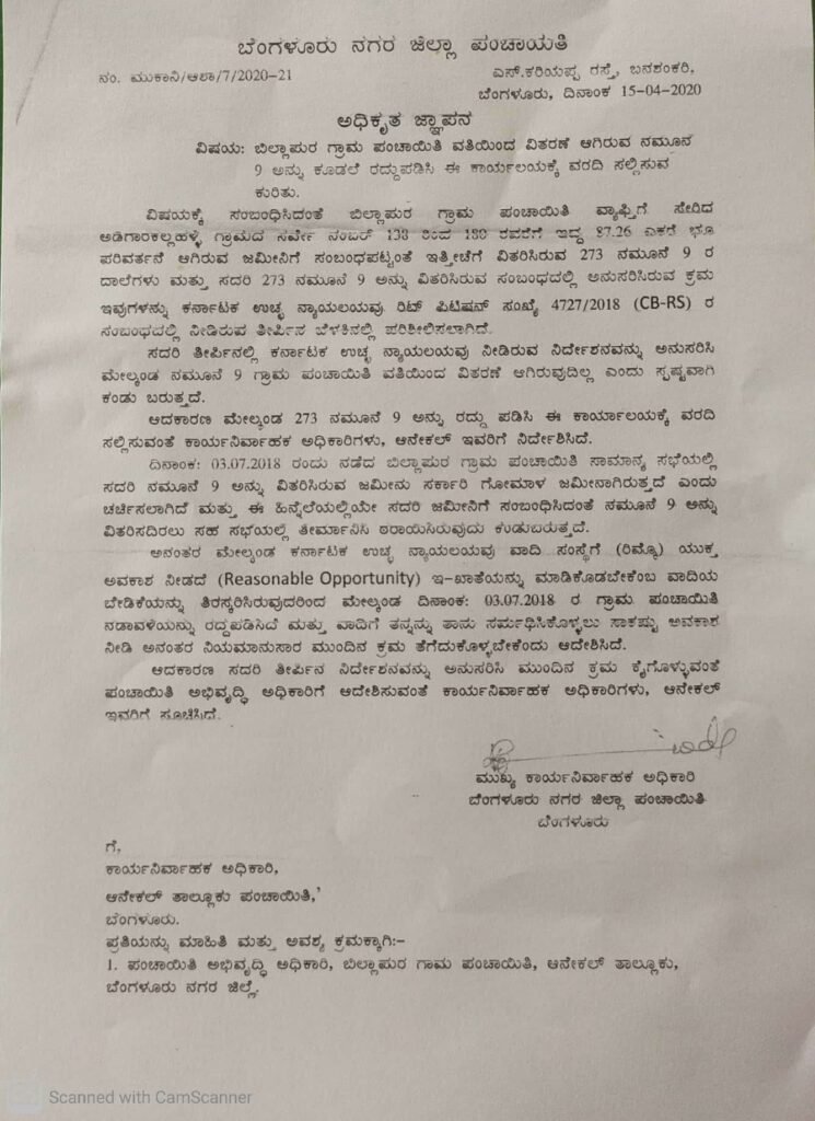 ‘ಬಿಲ್ಲಾಪುರ ಗ್ರಾಮ ಪಂಚಾಯ್ತಿಯಲ್ಲಿ 2018ರ ಜುಲೈ 3ರಂದು ನಡೆದ ಸಾಮಾನ್ಯ ಸಭೆಯಲ್ಲಿ 273 ಖಾತೆಗಳನ್ನು ವಿತರಿಸಿರುವ ಜಮೀನು ಸರ್ಕಾರಿ ಗೋಮಾಳ ಜಮೀನು ಆಗಿರುತ್ತದೆ ಎಂದು ಚರ್ಚಿಸಲಾಗಿದೆ. ಇದೇ ಹಿನ್ನೆಲೆಯಲ್ಲಿ ಈ ಜಮೀನಿಗೆ ಸಂಬಂಧಿಸಿದಂತೆ ನಮೂನೆ 9ನ್ನು ವಿತರಿಸದಿರಲು ಸಹ ಸಭೆಯಲ್ಲಿ ತೀರ್ಮಾನಿಸಿರುವುದು ಕಂಡುಬಂದಿರುತ್ತದೆ,’ ಎಂದು ಜಿಲ್ಲಾ ಪಂಚಾಯ್ತಿ ಮುಖ್ಯ ಕಾರ್ಯನಿರ್ವಹಣಾಧಿಕಾರಿಗಳು 2020ರ ಏಪ್ರಿಲ್ 15ರಂದು ತಾಲೂಕು ಪಂಚಾಯ್ತಿ ಇಒಗೆ ಅಧಿಕೃತ ಜ್ಞಾಪನ ಪತ್ರ ಹೊರಡಿಸಿದ್ದಾರೆ.