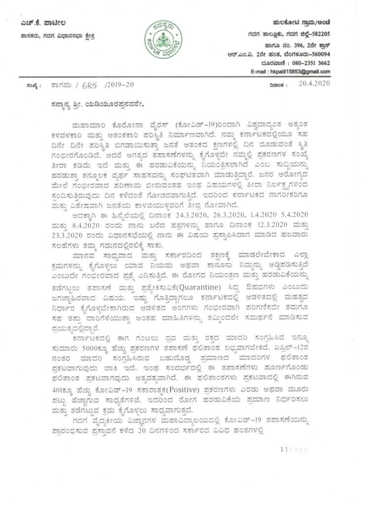 ‘ನಮ್ಮ ಕರ್ನಾಟಕದಲ್ಲಿಯೂ ಸಹ ದಿನೇ ದಿನೇ ಪರಿಸ್ಥಿತಿ ಬಿಗಡಾಯಿಸುತ್ತಾ ಜನತೆ ಆತಂಕದ ಕ್ಷಣಗಳಲ್ಲಿ ದಿನ ದೂಡುವಂತೆ ಸ್ಥಿತಿ ಗಂಭೀರಗೊಂಡಿದೆ. ಆದರೆ ಅಗತ್ಯದ ತಪಾಸಣೆಗಳನ್ನು ಕೈಗೊಳ್ಳದೇ ನಮ್ಮಲ್ಲಿ ಪ್ರಕರಣಗಳ ಸಂಖ್ಯೆ ತೀರಾ ಕಡಿಮೆ ಇದೆ ಮತ್ತು ಈ ಹರಡುವಿಕೆಯನ್ನು ನಿಯಂತ್ರಿಸಲಾಗಿದೆ ಎಂಬ ಸುದ್ದಿಯನ್ನು ಹರಡುತ್ತಾ ತನ್ಮೂಲಕ ವ್ಯರ್ಥ ಸಾಹಸವನ್ನು ಸಂಘಟಿತವಾಗಿ ಮಾಡುತ್ತಿದ್ದಾರೆ,’ ಎಂದು 2020ರ ಏಪ್ರಿಲ್ 20ರಂದು ಬರೆದಿರುವ ಪತ್ರದಲ್ಲಿ ವಿವರಿಸಿದ್ದಾರೆ.