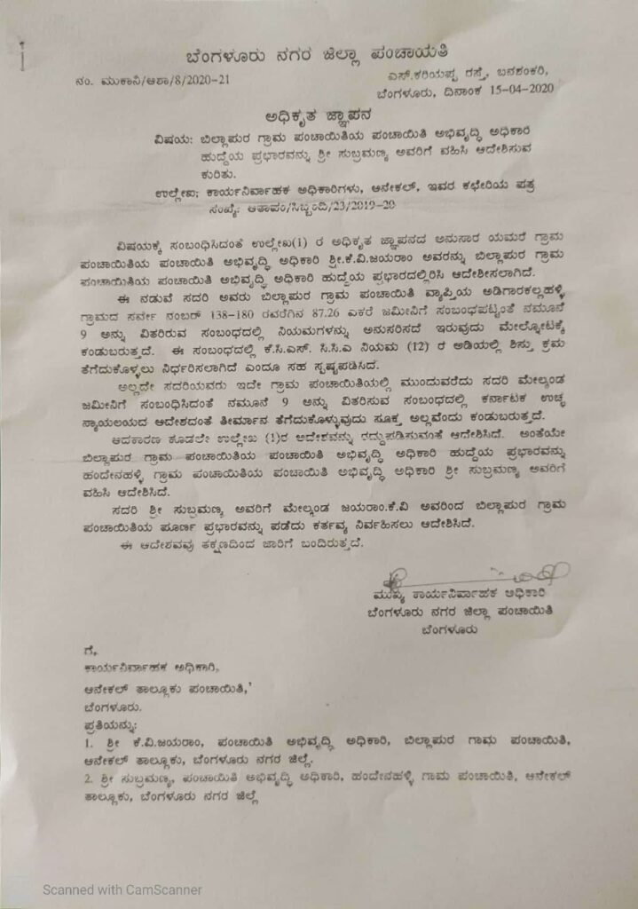 ‘ಇದಕ್ಕೆ ಸಂಬಂಧಿಸಿದಂತೆ ನಿಯಮಗಳನ್ನು ಅನುಸರಿಸದೇ ಇರುವುದು ಮೇಲ್ನೋಟಕ್ಕೆ ಕಂಡು ಬರುತ್ತದೆ. ಈ ಸಂಬಂಧ ಕೆಸಿಎಸ್ ಸಿಸಿಎ ನಿಯಮ(12)ರ ಅಡಿಯಲ್ಲಿ ಶಿಸ್ತುಕ್ರಮ ತೆಗೆದುಕೊಳ್ಳಲು ನಿರ್ಧರಿಸಿದೆ,’ ಎಂದು ಜಿಲ್ಲಾ ಪಂಚಾಯ್ತಿ ಮುಖ್ಯಕಾರ್ಯನಿರ್ವಾಹಕ ಅಧಿಕಾರಿ 2020ರ ಏಪ್ರಿಲ್ 15ರಂದು ಆನೇಕಲ್ ತಾಲೂಕು ಪಂಚಾಯ್ತಿ ಕಾರ್ಯನಿರ್ವಾಹಕ ಅಧಿಕಾರಿಗೆ ಪತ್ರ ಬರೆದಿದ್ದರು. ಪತ್ರ ಬರೆದು ವಾರ ಕಳೆದಿದ್ದರೂ ಬಿಲ್ಲಾಪುರ ಗ್ರಾಮಪಂಚಾಯ್ತಿ ಅಭಿವೃದ್ಧಿ ಅಧಿಕಾರಿ ವಿರುದ್ಧ ಈವರೆವಿಗೂ ಕ್ರಮಗೊಂಡಿಲ್ಲ ಎಂದು ತಿಳಿದು ಬಂದಿದೆ.