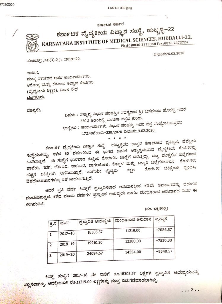 ಭಂಡ ನಿರ್ಲಕ್ಷ್ಯದ ಪರಮಾವಧಿಯನ್ನು ಪ್ರದರ್ಶಿಸುತ್ತಿರುವ ರಾಜ್ಯ ಸರ್ಕಾರ, ಅನುದಾನದ ಪ್ರಮಾಣವನ್ನು ಹೆಚ್ಚಿಸದೇ ಉತ್ತರ ಕರ್ನಾಟಕದ ಪಾಲಿಗೆ ಸಂಜೀವಿನಿಯಂತಿರುವ ಕಿಮ್ಸ್‌ ನ್ನು ಆರ್ಥಿಕ ಸಂಕಷ್ಟಕ್ಕೆ ದೂಡಿದೆ. ಕಿಮ್ಸ್‌ನ ನಿರ್ದೇಶಕರು ಆರೋಗ್ಯ ಮತ್ತು ಮತ್ತು ಕುಟುಂಬ ಕಲ್ಯಾಣ ಇಲಾಖೆಯ ಸರ್ಕಾರದ ಪ್ರಧಾನ ಕಾರ್ಯದರ್ಶಿಗೆ 2020ರ ಫೆ.20ರಂದು ಬರೆದಿರುವ ಪತ್ರ, ಹಲವು ವಿಷಯಗಳನ್ನು ಹೊರಗೆಡವಿದೆ.