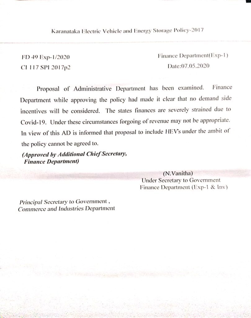 ‘ಅಡಳಿತ ಇಲಾಖೆಯ ಪ್ರಸ್ತಾವನೆ ಪರಿಶೀಲಿಸಲಾಯಿತು. ಕೋವಿಡ್‌ -19 ರ ಹಿನ್ನೆಲೆಯಲ್ಲಿ ರಾಜ್ಯದ ಆರ್ಥಿಕ ಪರಿಸ್ಥಿತಿ ಚಿಂತಾಜನಕವಾಗಿದೆ. ಹೀಗಾಗಿ ಪ್ರೋತ್ಸಾಹ ಧನ ಬೇಡಿಕೆ ಪ್ರಸ್ತಾವನೆಯನ್ನು ಈ ನೀತಿ ವ್ಯಾಪ್ತಿಯೊಳಗೆ ತರಲು ಸಾಧ್ಯವಿಲ್ಲ,’ ಎಂದು ಆರ್ಥಿಕ ಇಲಾಖೆಯ ಸರ್ಕಾರದ ಹೆಚ್ಚುವರಿ ಮುಖ್ಯ ಕಾರ್ಯದರ್ಶಿ, ಕೈಗಾರಿಕೆ ಮತ್ತು ವಾಣಿಜ್ಯ ಇಲಾಖೆಯ ಸರ್ಕಾರದ ಪ್ರಧಾನ ಕಾರ್ಯದರ್ಶಿಗೆ ಅಭಿಪ್ರಾಯ ತಿಳಿಸಿದ್ದಾರೆ.