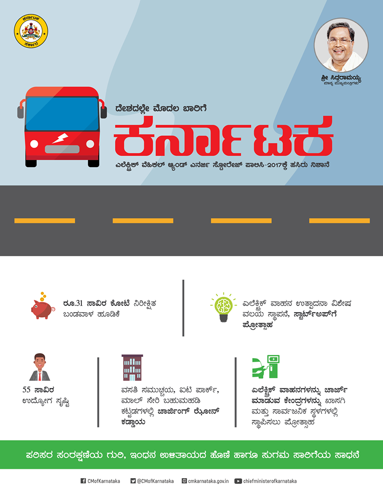 ಉದ್ಯಮ ಕ್ಷೇತ್ರ ಮತ್ತು ಸಾರ್ವಜನಿಕರಿಬ್ಬರಿಗೂ ಲಾಭವಾಗಬೇಕೆಂಬ ದೃಷ್ಟಿಯಿಂದ ರಾಜ್ಯವು ವಿದ್ಯುತ್‌ಚಾಲಿತ ವಾಹನಗಳು ಮತ್ತು ಇಂಧನ ಸಂಗ್ರಹಣೆ ನೀತಿ 2017ನ್ನು ಜಾರಿಗೆ ತಂದಿತ್ತು. ಇಂಥದೊಂದು ನೀತಿ ಕೇಂದ್ರ ಸರ್ಕಾರದಲ್ಲಾಗಲಿ, ಉಳಿದ ರಾಜ್ಯಗಳಲ್ಲಾಗಲಿ ಇಲ್ಲ. ಈ ಮೂಲಕ ಕರ್ನಾಟಕ ಹೊಸ ಮೈಲಿಗಲ್ಲನ್ನು ಸ್ಥಾಪಿಸಿತ್ತು.